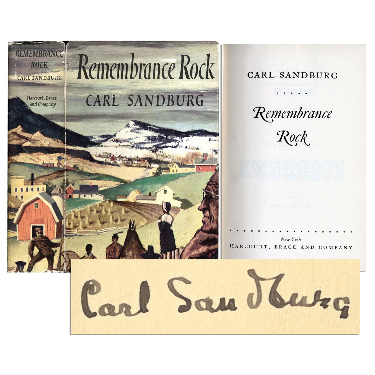 First edition, first printing of Carl Sandburg's novel, ''Remembrance Rock'' signed by the author. Harcourt, Brace and Co.: New York: 1948. Signed ''Carl Sandburg'' in fountain pen on the front free endpaper. Hardcover with dustjacket measures 5.75'' x 8.5'' and runs 1067 pages. Uniform block of toning on signature page and unobtrusive pencil notations in another hand. Clipped dustjacket has a few small tears to the spine and top edge of the dustjacket. Overall, an attractive copy in very good condition.