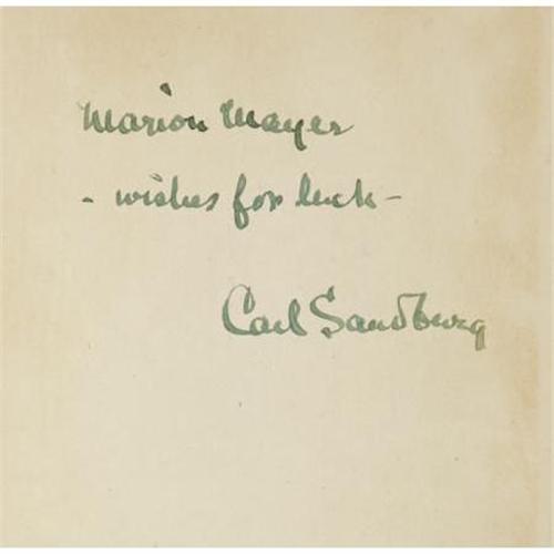 <B>Carl Sandburg. </B></I><B><I>Smoke and Steel</B></I></B></I><B>.</B></I> New York: Harcourt, Brace and Howe, 1920. <BR>First edition. Inscribed and signed by the author<B> </B></I>on initial flyleaf, "<I>Marion Mayer - Wishes for luck - Carl Sandburg</B></I>." Small Octavo. 268 pages.<BR><BR>Publisher's olive green paper with red lettering on cover and spine. Signed and dated by the original owner on leaf between flyleaf and title page: "Marion L. Mayer, October first, 1920." Minor shelfwear, light bumping to spine ends, but overall a near very fine copy.<BR><BR><b>Shipping:</b> Books & Catalogs (<a target="_blank" href="http://www.heritageauctions.com/common/shipping.php">view shipping information</a>)
