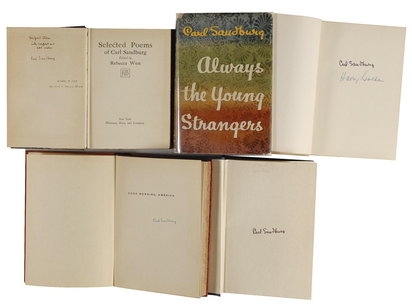Five hardcover books, each signed in ink on an opening page. Titles are: Selected Poems of Carl Sandburg (ins), Carl Sandburg, Good Morning, America, Always the Young Strangers, and Remembrance Rock. In very good overall condition.