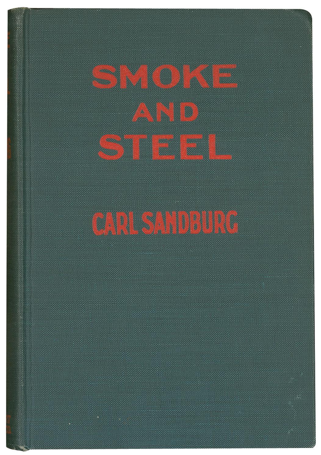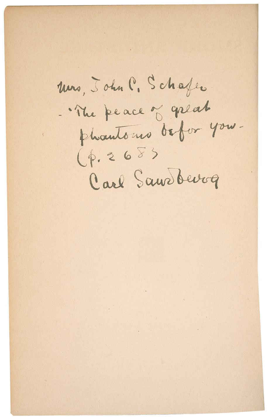 Signed book: Smoke and Steel. First edition, first printing. NY: Harcourt, Brace and Company, 1920. Hardcover, 5.25 x 7.75, 268 pages. Signed and inscribed on the reverse of the second free end page, “Mrs. John C. Schafer ‘The peace of great phantoms before you’ (p. 268), Carl Sandburg.” Mild toning to signed page, as well as all other pages, pencil notation to back pastedown, hinges a bit loose, but intact, and light wear to covers and spine, otherwise fine condition.