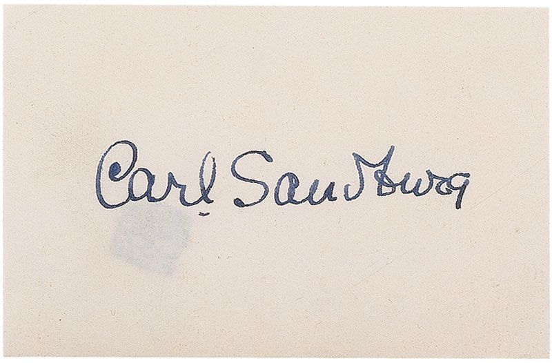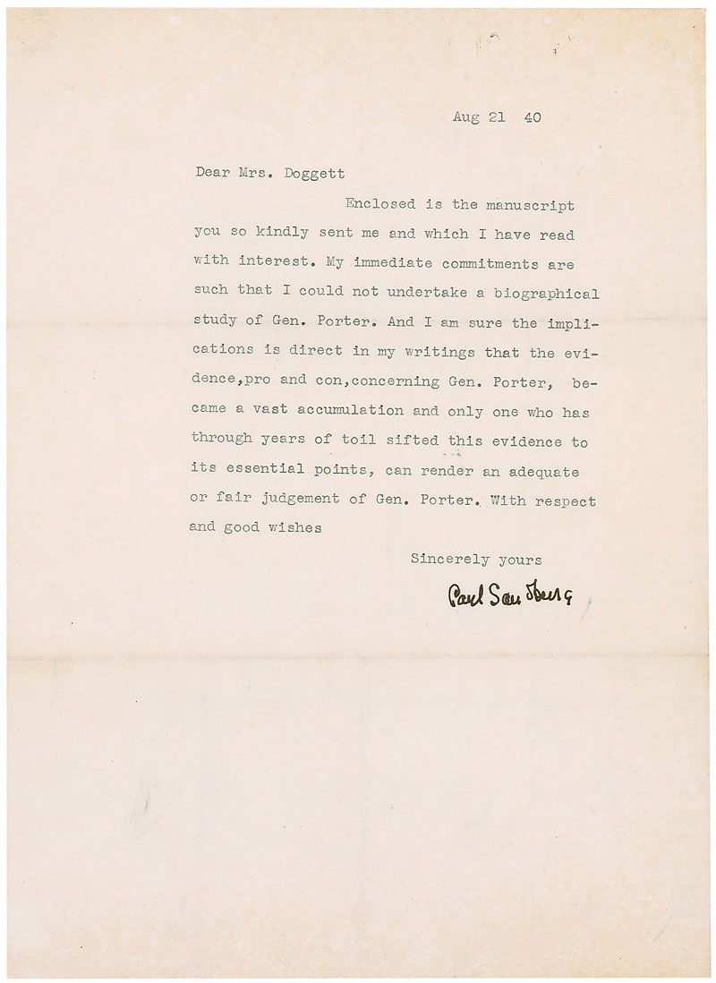 TLS, one page, 8 x 11, personal letterhead, August 21, 1940. In part: “Enclosed is the manuscript you so kindly sent me which I have read with interest. My immediate commitments are such that I could not undertake a biographical study of Gen. Porter…only one who has through years of toil sifting this evidence to its essential points, can render an adequate or fair judgement of Gen. Porter.”; and a bold ink signature, “Carl Sandburg,” on an off-white 4 x 2.5 slip. In fine condition, with intersecting folds to letter, one through a single letter of signature, as well as some mild toning.