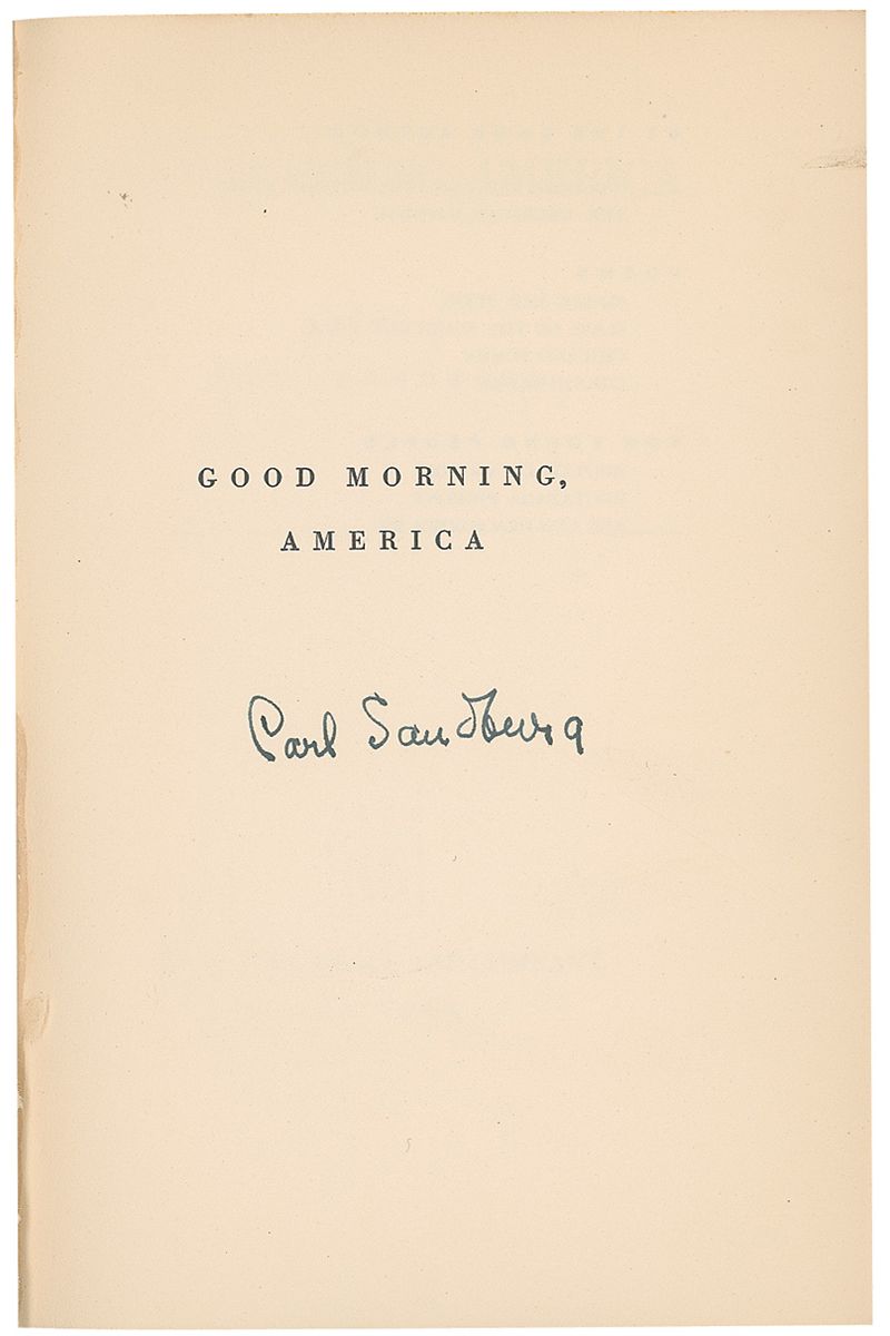 Signed book: Good Morning America. Later printing (library edition). NY: Harcourt, Brace and Company, 1928. Hardcover, 5.75 x 8.25, 249 pages. Signed on the half-title page in black ink. Toning and notations to opening and closing pages and pastedowns, corner bumps and soiling to boards, library stamps, and handwritten notation on spine, otherwise fine condition.
