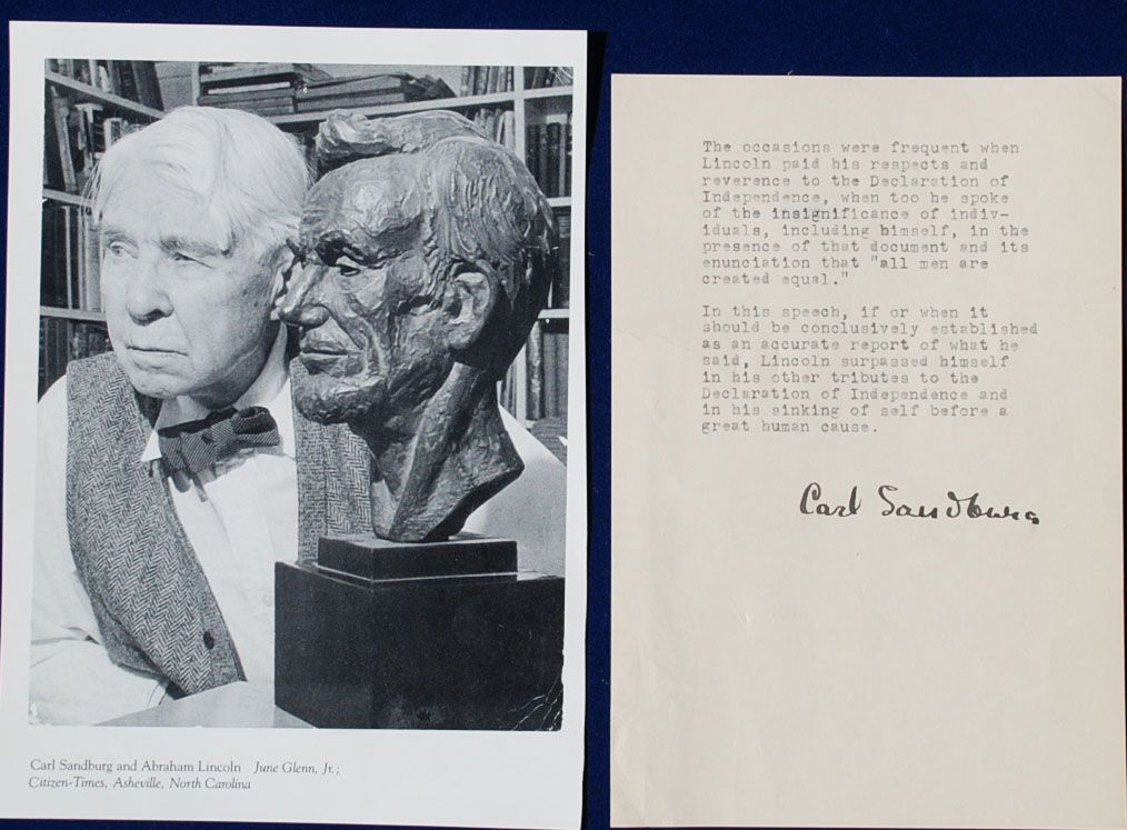 Fantastic Excerpt possibly from one of Sandburg's books on Lincoln signed by Sandburg in fountain pen. It refers to Lincoln, and his reverence to the Declaration of Independence and "That All Men Are Created Equal". Great Content!