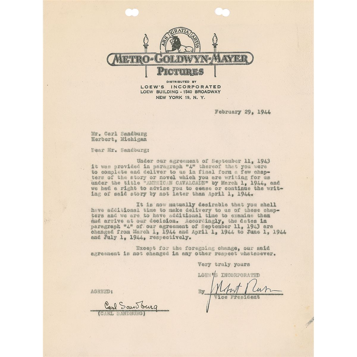 DS, one page, 8.5 x 11, February 29, 1944. Agreement between Sandburg and MGM Pictures in which he agrees to an extended deadline to “complete and deliver…in final form a few chapters of the story or novel which you are writing for us under the title ‘American Cavalcade.’” In fine condition, with expected document wear. Accompanied by a clipped book photo of the writer. The film, which was set to star Spencer Tracy and Katharine Hepburn, never came to fruition, but Sandburg’s script for American Cavalcade served as the basis of his only novel, Remembrance Rock.