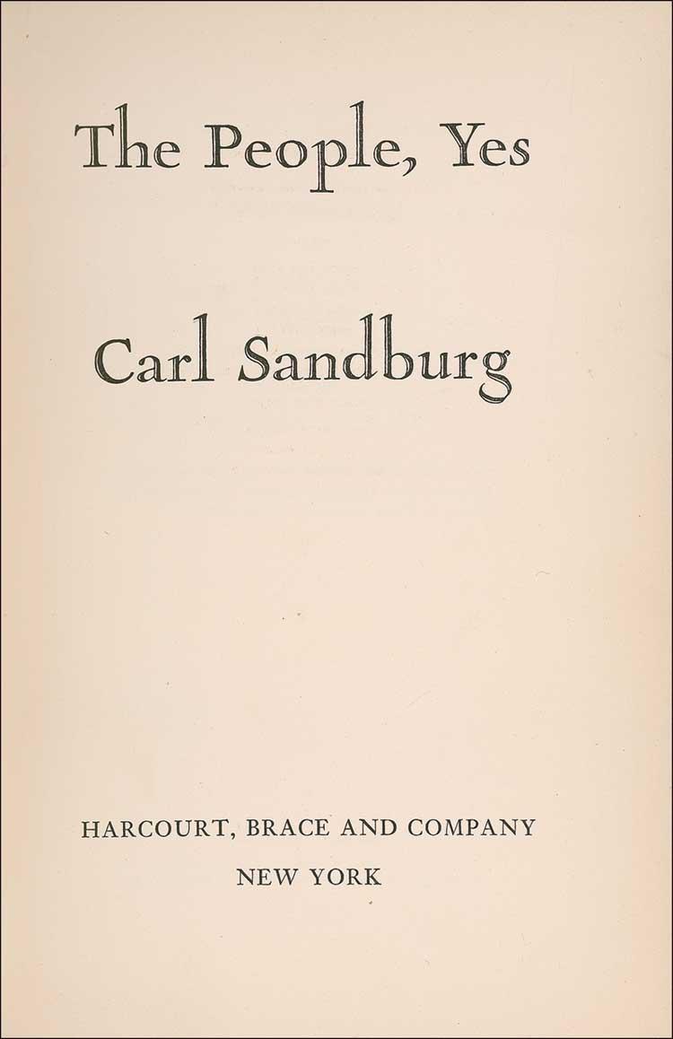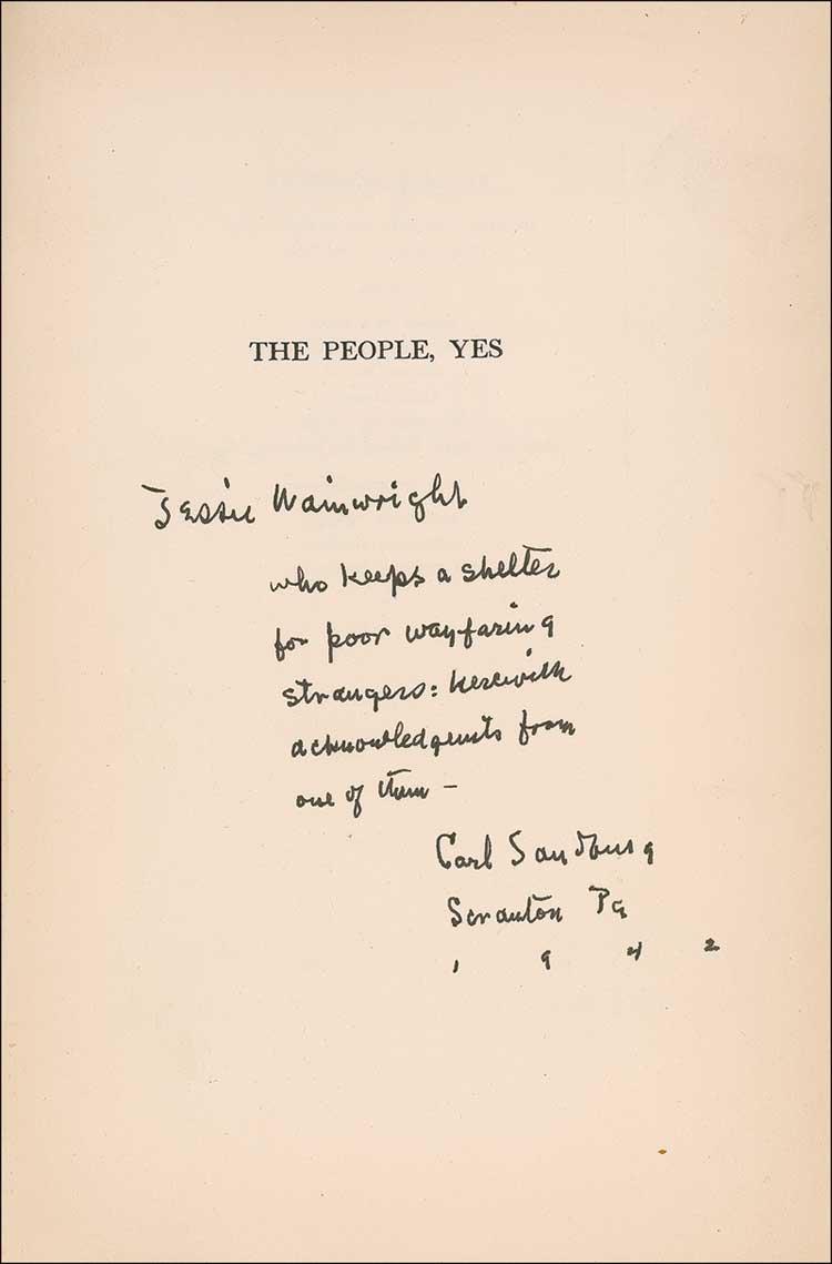 Signed book: The People, Yes. First edition, after printing 270 De Luxe copies. NY: Harcourt, Brace and Company, 1936. Hardcover, 6 x 8.5, 286 pages. Signed and inscribed on the half-title page, “Jessie Wainwright, who keeps a shelter for poor wayfairing strangers: herewith acknowledgements from one of them—Carl Sandburg, Scranton Pa, 1942.” In fine condition, with a mild shade of toning to opening pages, a bit heavier to first free end page, sunning and wear to spine, and light toning to covers. RRAuction COA.