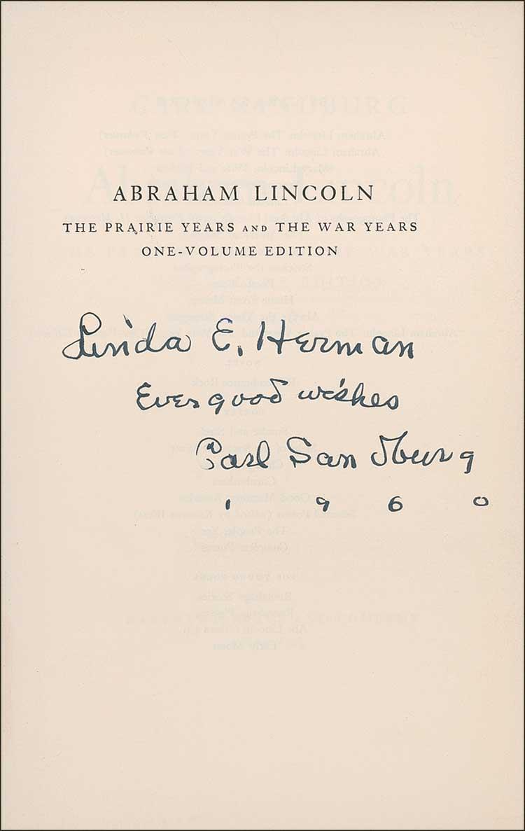 Signed book: Abraham Lincoln: The Prairie Years and the War Years. First edition. NY: Harcourt, Brace and Company, 1954. Hardcover with dustjacket, 6.5 x 9.5, 762 pages. Signed and inscribed on the half-title page “Linda E. Herman, ever good wishes, Carl Sandburg 1960.” In fine condition, with some scattered light toning and soiling to dustjacket. RRAuction COA.