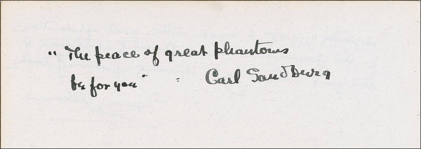AQS, signed “Carl Sandburg,” on an off-white 7.75 x 3 album page. Sandburg writes: “’The peace of great phantoms be for you.” In fine condition, with some light show-through from writing on reverse. Pre-certified PSA/DNA and RRAuction COA.