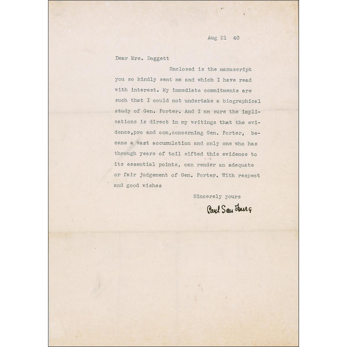 Pulitzer Prize winning writer and editor (1878–1967) best known for his poetry. TLS, one page, 8 x 11, August 21, 1940. Sandburg writes to Mrs. Doggett. In full: “Enclosed is the manuscript you so kindly sent me and which I have read with interest. My immediate commitments are such that I could not undertake a biographical study of Gen. Porter. And I am sure the implications is direct in my writings that the evidence, pro and con, concerning Gen. Porter, became a vast accumulation and only one who has through years of toil sifted this evidence to its essential points, can render an adequate or fair judgement of Gen. Porter.” In fine condition, with intersecting fold lines and faint edge toning.