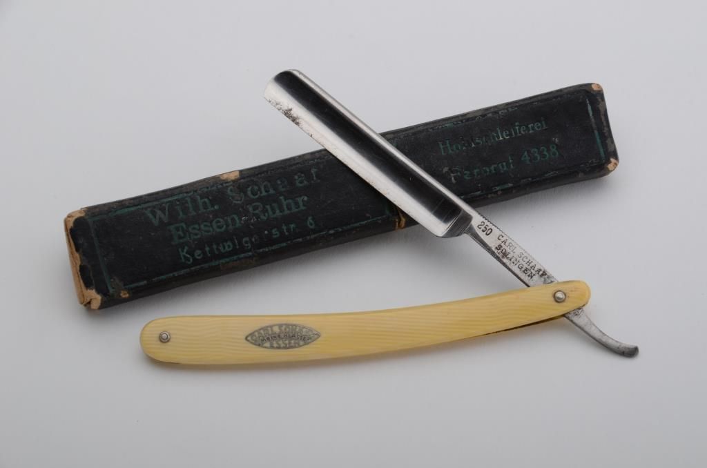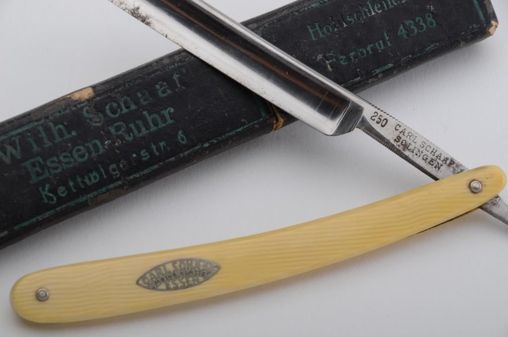 Carl Schaaf, Solingen straight razor with celluloid handle in Wilh. Schaaf two-piece box; razor in overall very good condition; box is overall good with some wear on ends and edges. Est.: $25-$50.