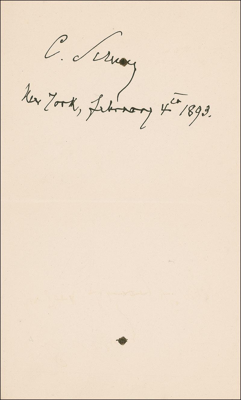 German-born Union general (1829–1906) who served as secretary of the interior under President Rutherford B. Hayes. Ink signature, “C. Schurz, New York, February 4th, 1893,” on an off-white 4.5 x 7.25 sheet. In fine condition.