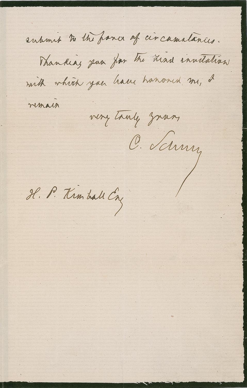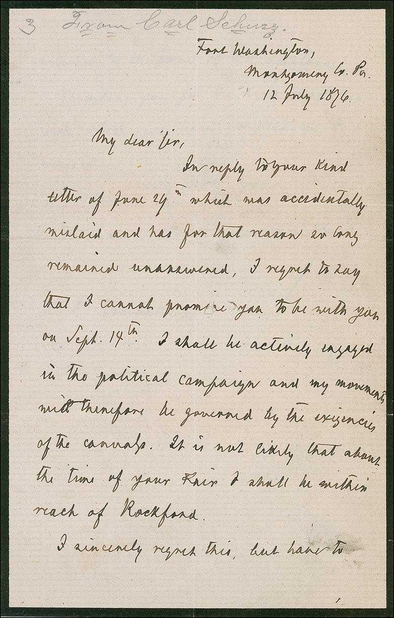 German-born Union general (1829–1906) who served as secretary of the interior under President Rutherford B. Hayes. ALS signed “C. Schurz,” two black-bordered pages on two adjoining sheets, 5.25 x 8.25, July 12, 1876. Letter to H. P. Kimble. In part: “I regret to say that I cannot promise you to be with you on Sept. 14th. I shall be actively engaged in the political campaign and my movements will therefore be governed by the exigencies of the canvas.” In very good condition, with intersecting folds, scattered toning and soiling, light creasing and two small holes to first page of letter.