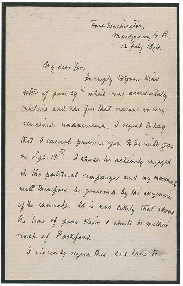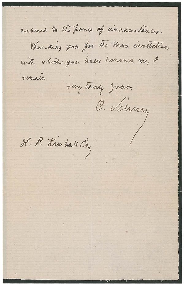 German-born Union general (1829–1906) who served as secretary of the interior under President Rutherford B. Hayes. ALS signed “C. Schurz,” two pages on two adjoining sheets, 5.25 x 8.25, black-bordered stationery letterhead, July 12, 1876. Letter to H. P. Kimble. In part: “I regret to say that I cannot promise you to be with you on Sept. 14th. I shall be actively engaged in the political campaign and my movements will therefore be governed by the exigencies of the canvas.” In very good condition, with intersecting folds, scattered toning and soiling, light pencil notations to top edge, light creasing, and two small holes to first page of letter.