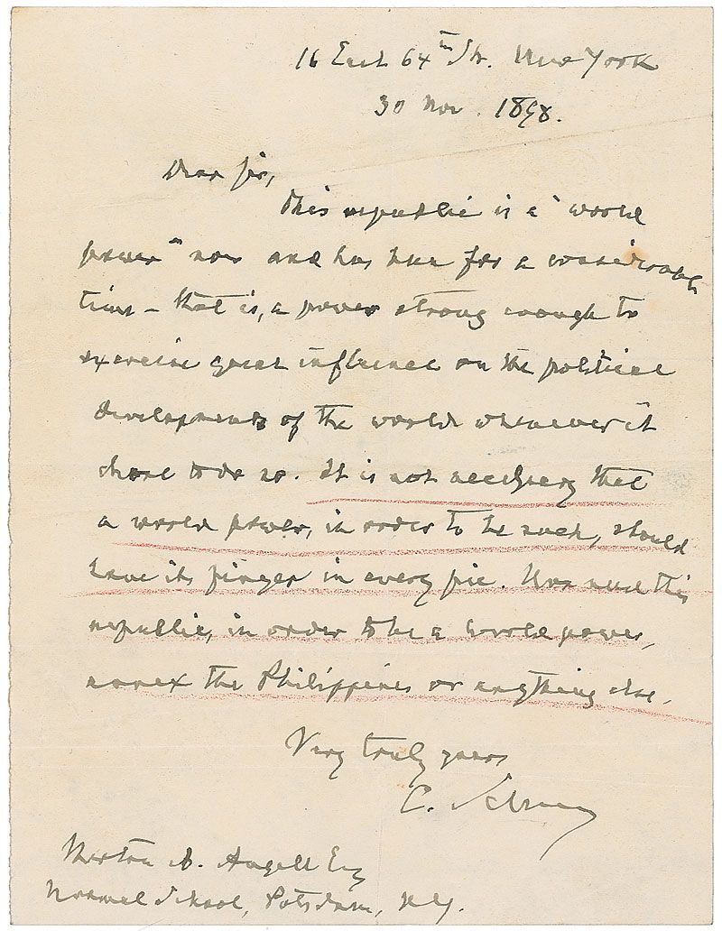 German-born Union general (1829–1906) who served as secretary of the interior under President Rutherford B. Hayes. ALS signed “C. Schurz,” one page, 5.25 x 6.75, November 30, 1898. Letter to Morton Angell. In full: “This republic is a ‘World Power’ now and has been for a considerable time—that is, a power strong enough to exercise great influence on the political developments of the world whenever it chose to do so. It is not necessary that a world power, in order to be such, should have its finger in every pie. Nor must this republic, in order to be a world power, annex the Philippines or anything else.” In fine condition, with intersecting folds and last five lines of text underlined in red pencil. After his military service, Schurz was prominent in American politics serving in various posts. His strong beliefs led to his membership in the American Anti-Imperialist League and he strongly urged President McKinley to resist annexing land after the Spanish-American War.