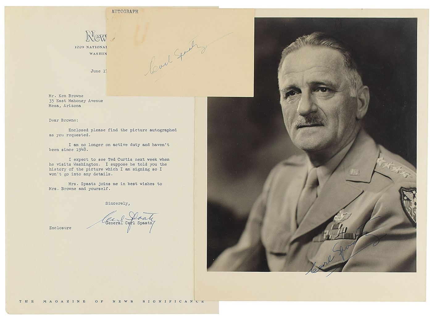 Three items: an off-white 5 x 3 card signed in fountain pen by Carl Spaatz; a vintage matte-finish 8 x 10 photo of Spaatz in his military uniform, signed in fountain pen; and a TLS, one page, 7.25 x 10.5, Newsweek letterhead, June 17, 1959, addressed to Ken Browne, in part: "Enclosed please find the picture autographed as you requested. I am no longer on active duty and haven't been since 1948." In overall very good to fine condition, with paperclip impressions to both the photo and signed card.