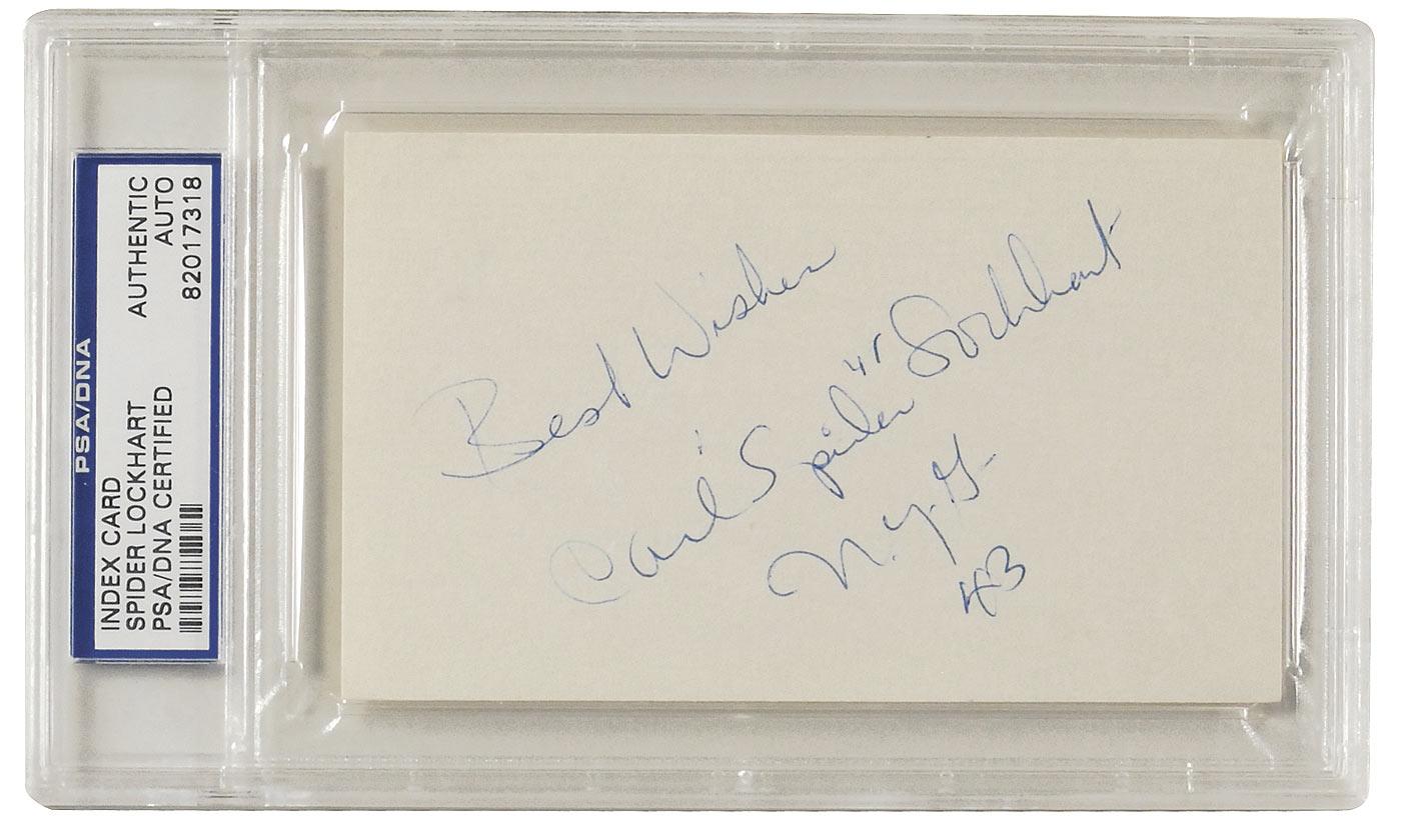 Ballpoint signature, “Best wishes, Carl ‘Spider’ Lockhart, N.Y.G. 43,” on an off-white 5 x 3 card. Encapsulated in a plastic PSA/DNA authentication holder. In fine condition.