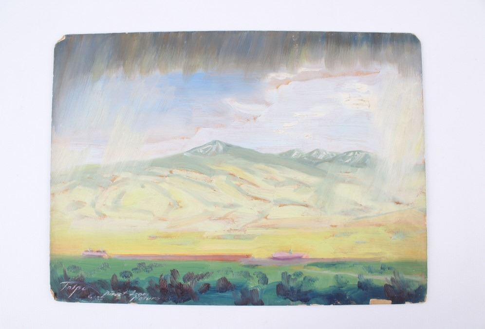 Included in this lot is an original signed Carl Tolpo Direct From Nature oil painting from 1935. Carl Tolpo was born in Ludington, Michigan in 1901. During the course of his career, he established his reputation as a portrait, genre and landscape painter as well as a portrait and figure sculptor. As a painter, his works in fine oil portraiture particularly include State portraits and landscape oil paintings of the western USA, mostly the Yellowstone Park region. His works are on display in the National Museum of Wildlife Art in Jackson Hole, Wyoming. This 1935 Montana landscape painting by Carl Tolpo, portrays a view of sunlit Mount Edith in the distance sloping down to the sunny valley of White Sulphur Springs and dramatically in the foreground are incoming dark storm clouds with rain. The piece is signed "Tolpo 6/35 Direct From Nature". The artwork measures 14" by 10 1/4".