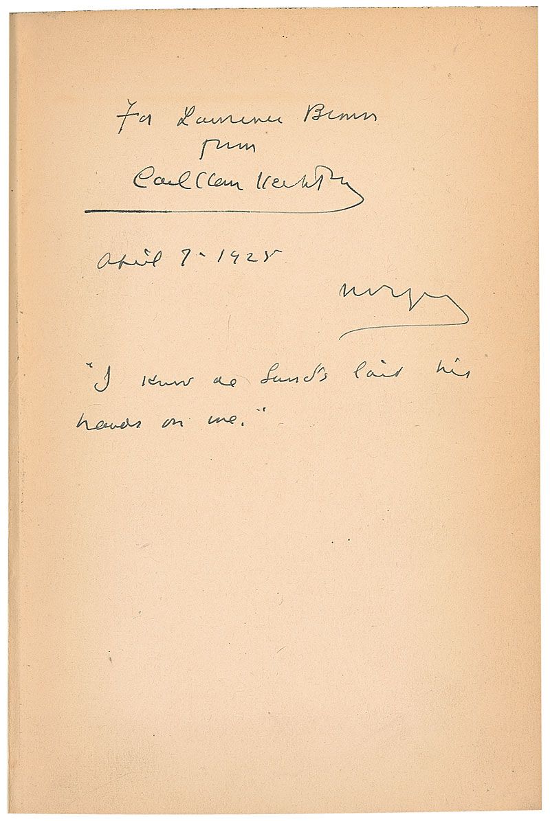 Writer and photographer (1880–1964) who was the literary executor of Gertrude Stein. Signed book: The Tattooed Country. First edition, first printing. NY: Alfred A. Knopf, 1924. Hardcover, 5.25 x 7.5, 1924 pages. Signed and inscribed on the first free end page, “For Laurence Benn from Carl Van Vechten, ‘I know de Lund’s laid his hands on me.’” In very good condition, with mild toning to all pages, loose front hinge, sunning to spine, and light wear to covers.