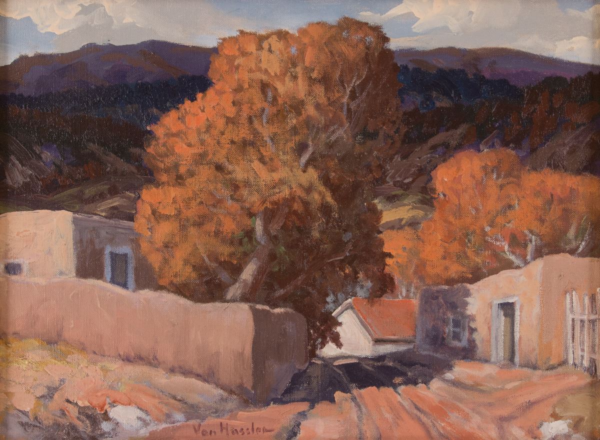 Carl Von Hassler (1886-1969). New Mexico Village in Late Fall. 12" x 16" oil on canvas. Signed lower left/center.