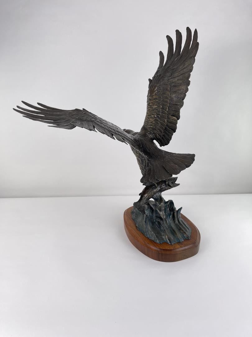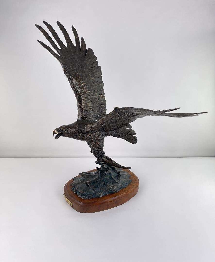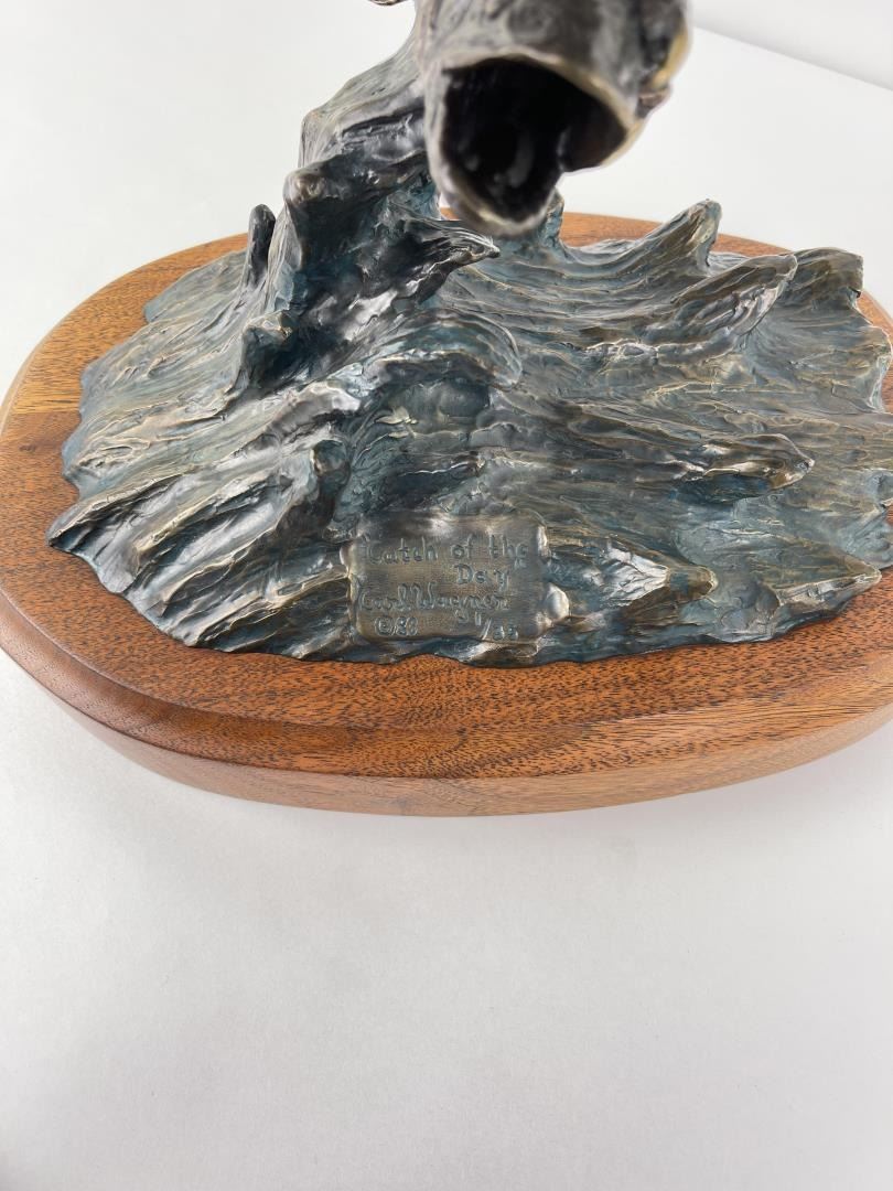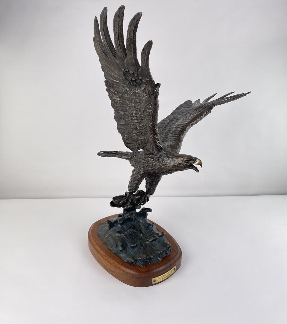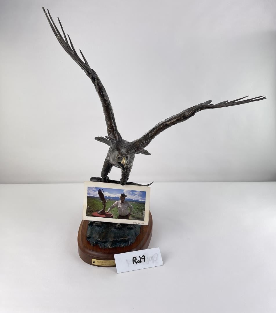 29" tall, 24" long. Carl Wagner (1938 - 2011) was active/lived in Florida, New Jersey. Carl Wagner is known for Small scale animal and bird sculpture. Carl Wagner Obituary from the Denver Post, 8/13/2011 Carl Wagner, sculptor of thousands of bronze animals and birds, died July 5 in Naples, Fla., from complications following heart surgery. He was 72. Service arrangements are pending, said his son, Rodd Wagner of Salida. Wagner sculpted and cast limited-edition bronzes at what he called his Hurricane Hill Art Works, 5 miles west of Salida. He chose the name because of the winds, said his daughter, Tracy Beach, also of Salida. Wagner came to Colorado in the 1970s with the aim of opening his own foundry. He did that and then started doing his own art. "He just switched gears when he moved to Colorado," said Rodd Wagner. "He thought originally of making something to sell; he had never been to art school." But Wagner’s work has been shown around the country, and for decades he and his wife, Barbara, traveled in a van to art festivals, his son said. Carl Wagner’s work ranged from thimbles and 6-inch-high bronze mugs, or steins, to life-size buffalo, eagles and other birds. Two mugs wound up in the hands of Ronald Reagan when he was president. One of Wagner’s customers sent them to the president, and Reagan later sent him a note and a medal. Wagner did many commissioned pieces, all eagle statues, for American Airlines, Anheuser-Busch and the Federal Reserve Bank. The companies used them for awards. His works are in several parks. Wagner worked in a 5,000-square-foot foundry he built near his house outside Salida. "He designed and built all his own machinery," said his daughter. The work "was very labor intensive" said his son.