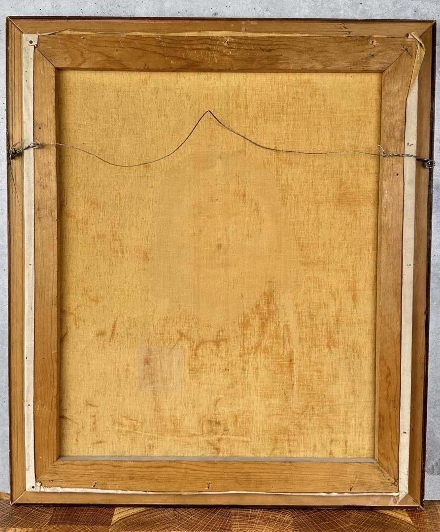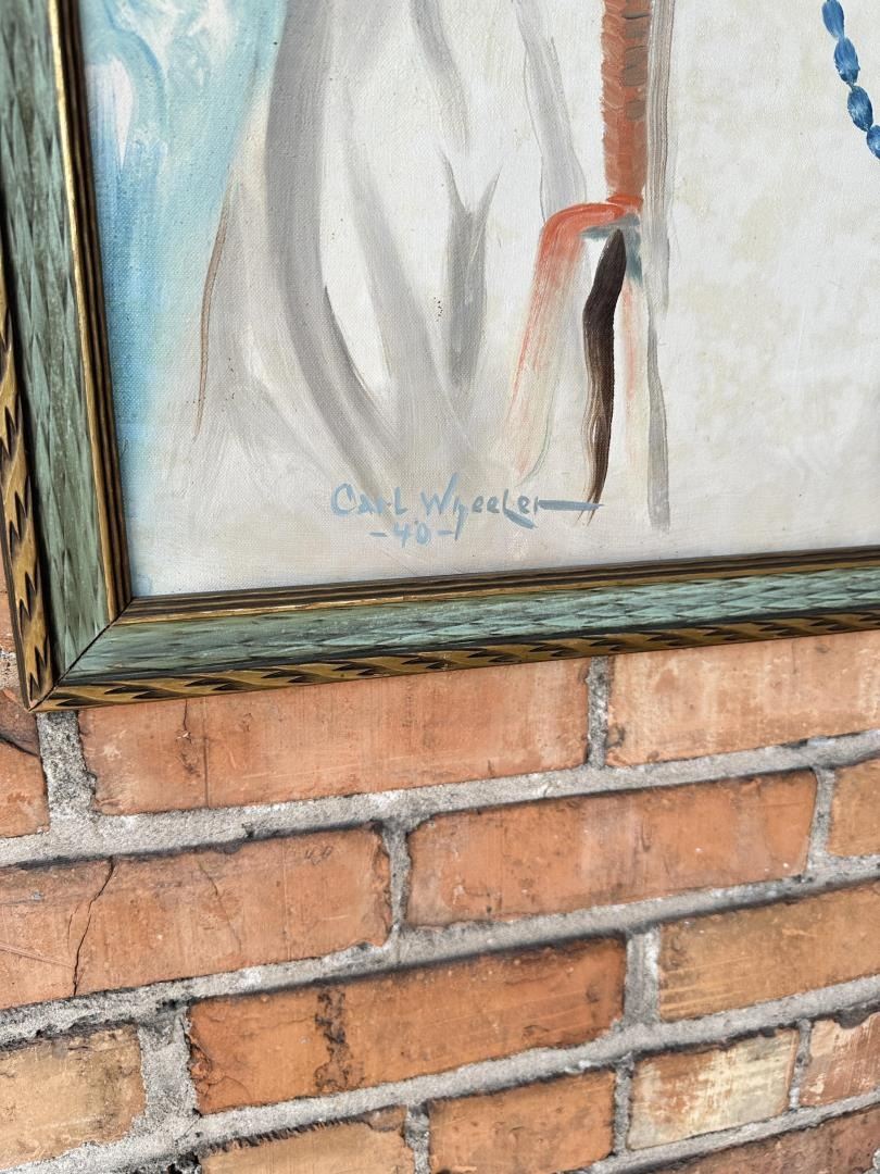 30 3/4" by 26 1/2" framed. Dewitt Carlton Wheeler is the artist. The only reference we can find of the artist is a Butte Montana Standard Newspaper Article from 1942 where he exhibited with William Standing. Dewitt Carlton Wheeler was born on 21 December 1892, in Rosebud, Rosebud, Montana, United States, his father, Dewitt Clinton Wheeler, was 47 and his mother, Minnie Little-Fish Abbott, was 30. He married Margaret Hill before 1911. They were the parents of at least 3 daughters. He lived in Montana, United States for about 5 years and School District 6 Lame Deer, Rosebud, Montana, United States in 1940. He died on 23 October 1956, in Spokane, Spokane, Washington, United States, at the age of 63, and was buried in Sandpoint, Bonner, Idaho, United States.