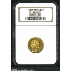 Carl XIV Gold Ducat 1818, Head right/Crowned arms in order chain with date below, F-84, KM-409, MS62