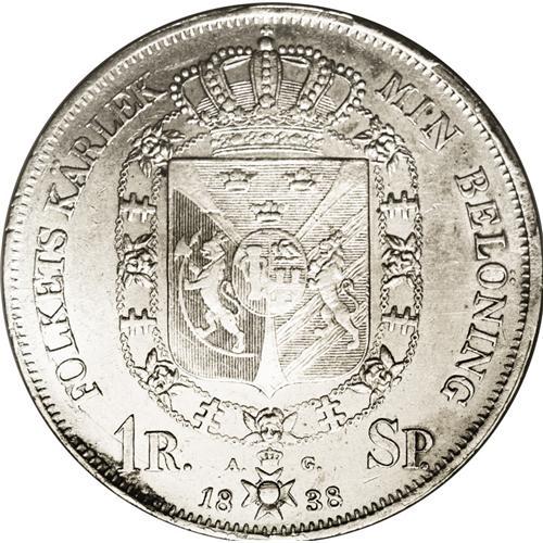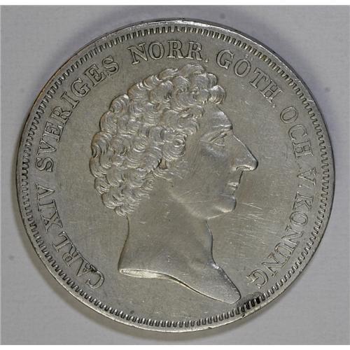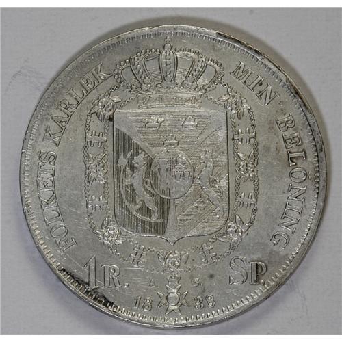 <B>Carl XIV Johan Riksdaler Specie 1838-AG, </B></I>KM632, XF details but harshly cleaned at one time leaving obvious hairlines.<BR><I>From the Blue Ridge Collection</B></I><BR><BR><b>Shipping:</b> Coin/Currency (<a target="_blank" href="http://www.heritageauctions.com/common/shipping.php">view shipping information</a>)