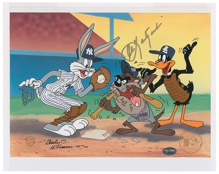Limited edition hand-painted color animation cel, 11.5 x 10.25, #AP 14/20, depicting Taz, in a Red Sox uniform, throwing a fit after striking out against Bugs Bunny’s Yankees, as umpire Donald Duck makes the call. Signed in gold ink by Yastrzemski and in black felt tip by Charles McKimson, and set against a pre-printed color background. In fine condition, with a PSA/DNA authentication label affixed to bottom corner. Accompanied by a certificate of authenticity from PSA/DNA.