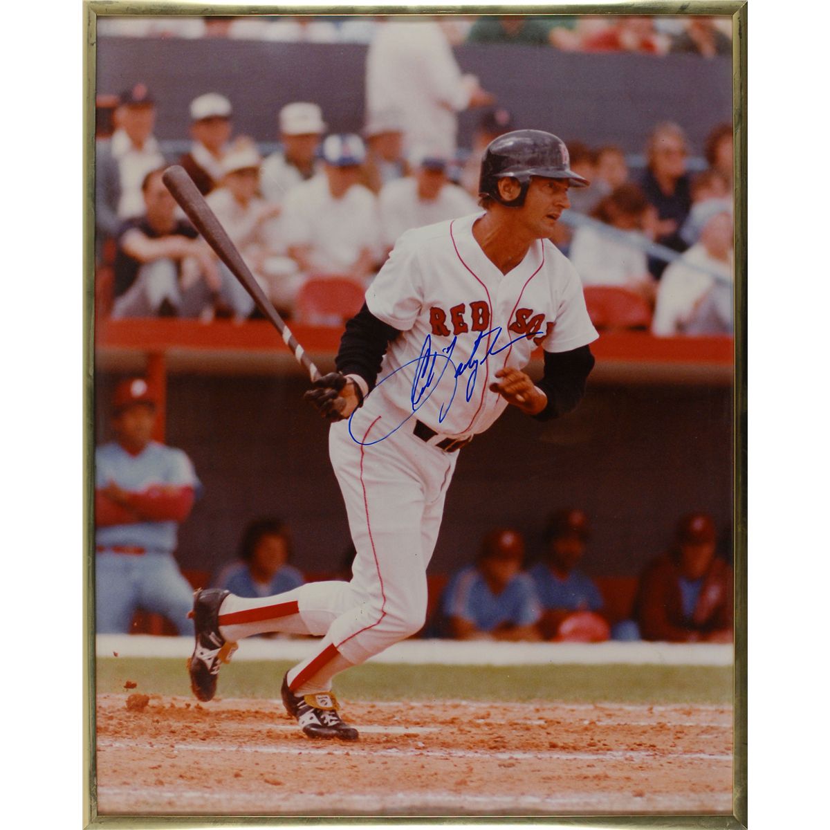 Color 15.5 x 19.5 photo of Yaz running out of the batter’s box, signed in blue felt tip. Framed to an overall size of 16.5 x 20.5. In fine condition, with some rippling to lower edge.
