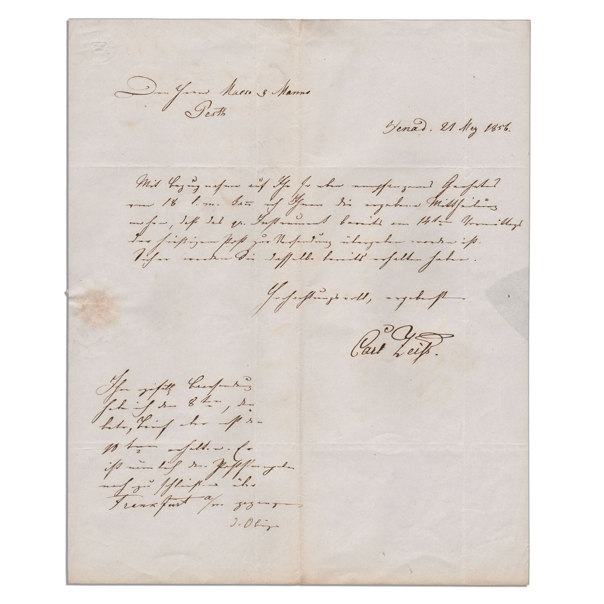 Carl Zeiss 1856 autograph letter signed, dated 21 March 1856 from Pesth, Hungary. Zeiss founded the famed optical ''Carl Zeiss AG'' lens, which had a wider aperture range allowing for brighter light and wider views. Eventually, his lenses made their way around the world and particularly, into the business of camera lenses. Signed boldly, ''Carl Zeiss'', document is written in 19th century German script. Document may relate to the lens, as they became prevalent in the 1840's, and has an additional note at lower right corner. Verso has postmark and is addressed to Masso & Manno in Pesth. Letter on one page with card-style fly leaf measures 8.5'' x 10.5''. Very minor toning and foxing, else near fine.