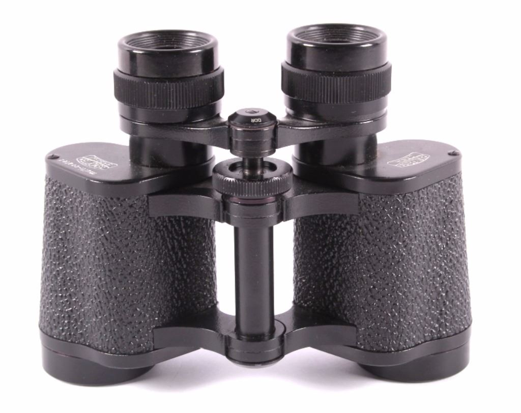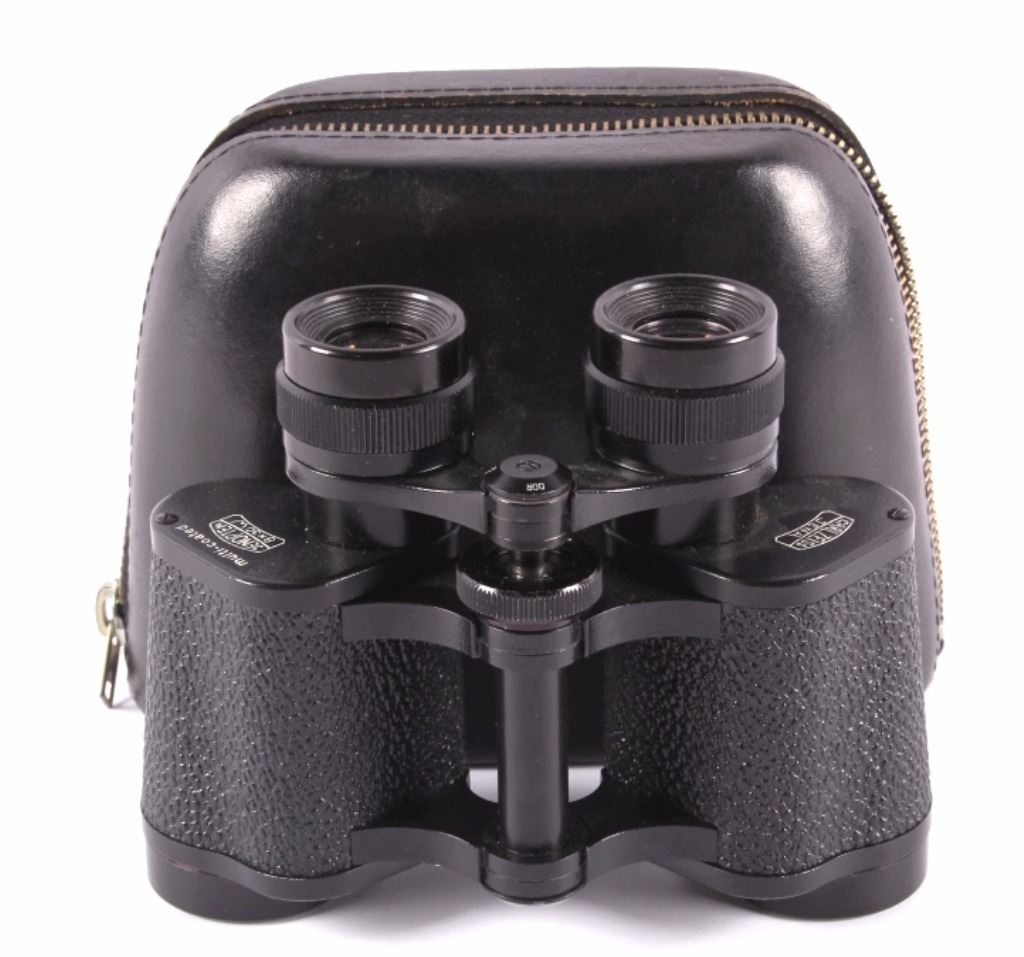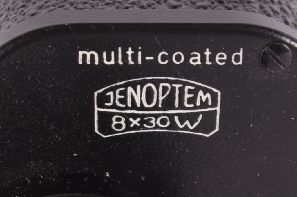 This is a very good condition set of Carl Zeiss Jena Jenoptem 8x30w German multi-coated binoculars. The binoculars have very clean and clear optics and comes with a black leather case. Binoculars measure 6 3/8"x4 5/8". Marked DDR.