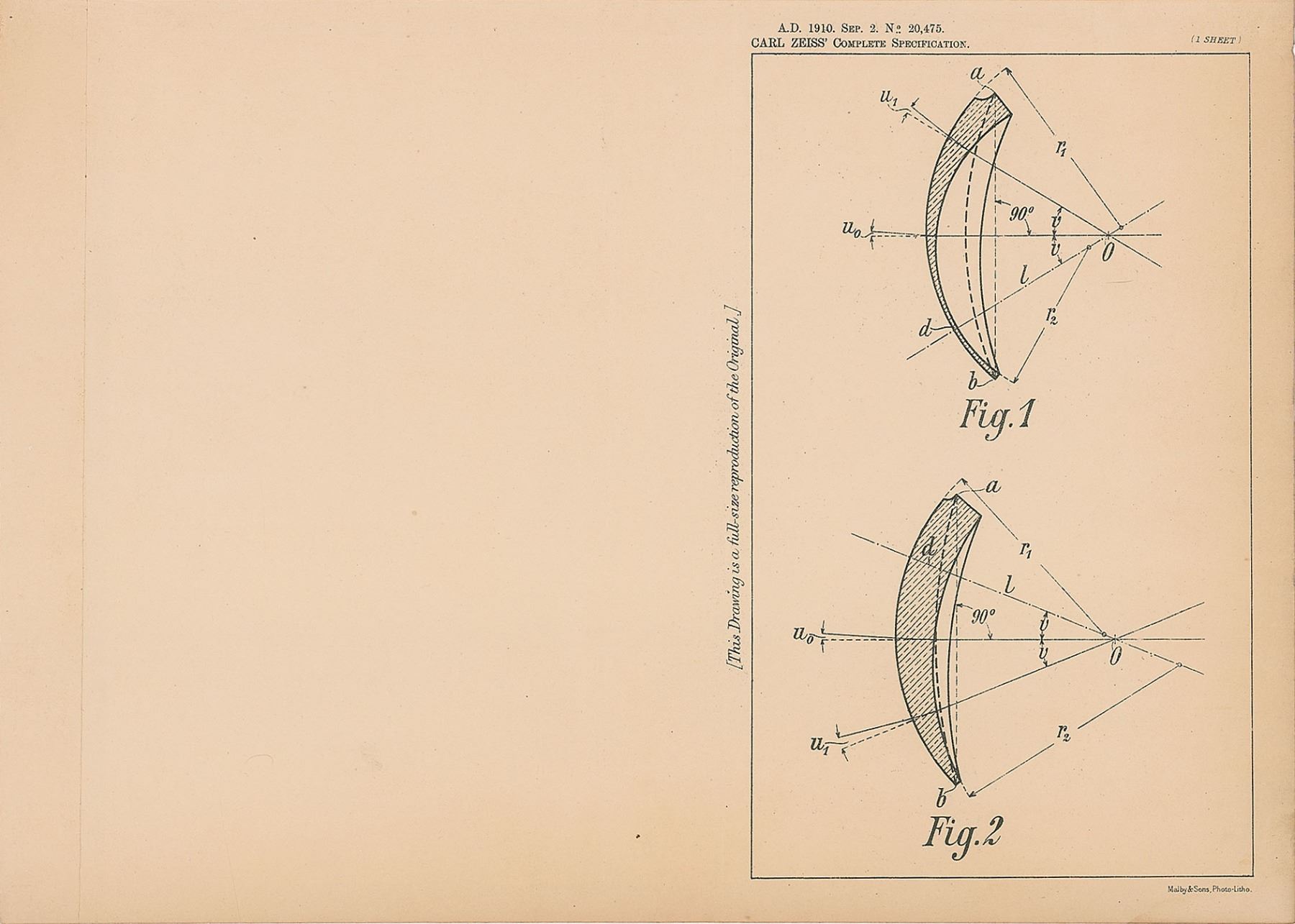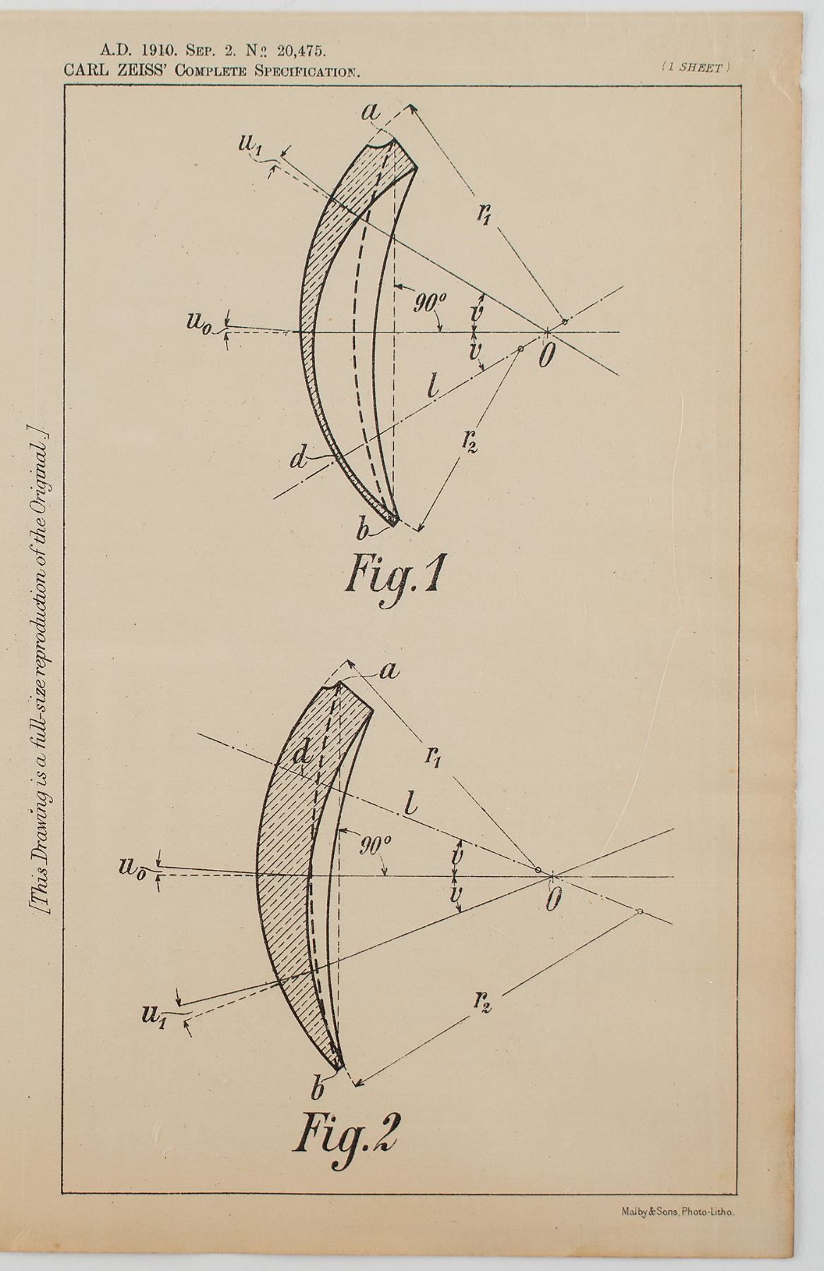 Original linen-backed patent lithograph for Carl Zeiss's improvement of a lens, one page, 14.25 x 10.25, September 2, 1910. The diagram features two angles of the crescent-shaped lens. The top border reads: "A.D. 1910. Sep. 2. No. 20,475. Carl Zeiss' Complete Specification." The lower border features the printed text: "Malby & Sons, Photo-Litho." The left border reads: "This Drawing is a full-size reproduction of the Original." In fine condition.