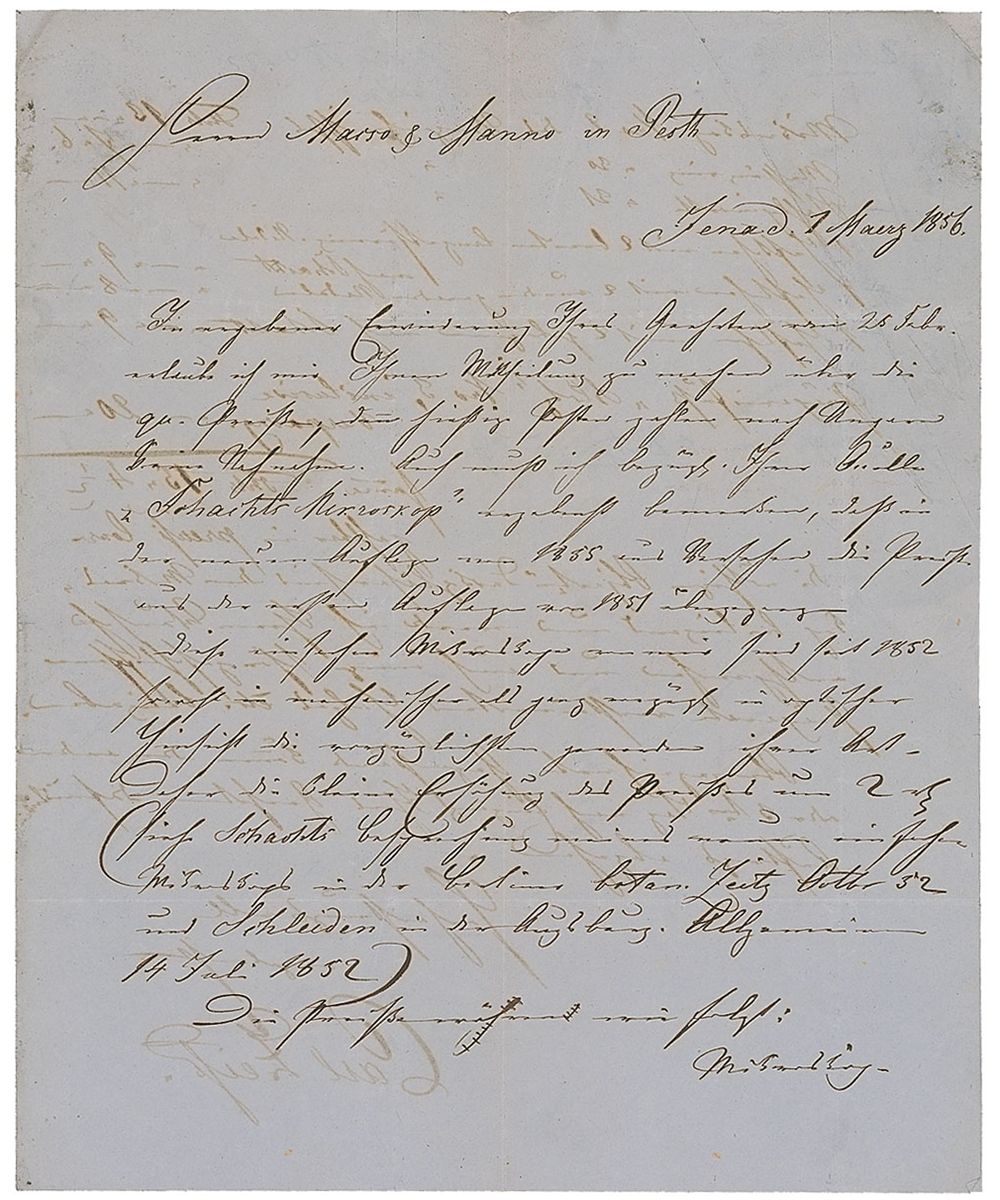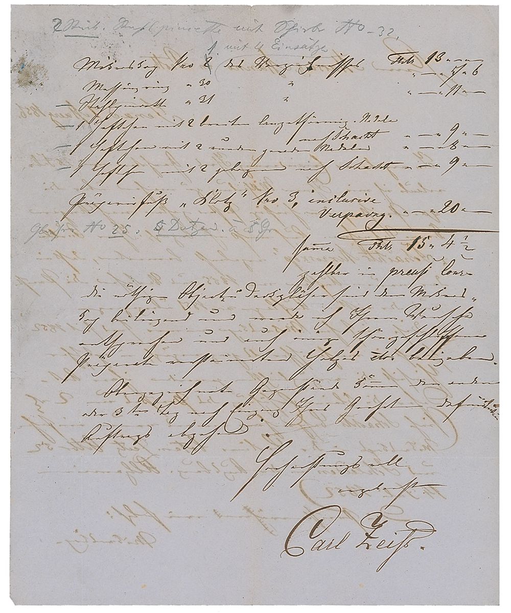 German maker of optical instruments (1816–1888) known for his very high quality, large aperture lenses. ALS in German Sutterlin script, one page both sides, 8.5 x 10.5, March 1, 1856, Jena. Letter to “Mr. Macso & Manno in Pest,” in full (translated): “In response to your value letter dated February 25th, I’d like to inform you of our Prussian prices, since local post offices don’t send cash on delivery to Hungary. Pertaining to your source of ‘Schacht’s microscope’ I also should most humbly add that the prices from the first edition, which was printed in the year 1851, were by mistake copied into the new edition of the year 1855. Since 1852 I have made mechanical, as well as excellent optical improvements, making them the most exquisite of their kind. That is the reason of the small increase in prices of 2 Reichstaler (see Schacht’s description of my new, basic microscope in the Berliner Botan[ical] Magazine of October 52, and Schleiden’s in the Augsburg Allgemeine [newspaper] dated 14 July 1852).” Zeiss goes on to offer a list of prices for various parts, including a dissecting base, steel tweezers, needles, and glasses, concluding: “The required cover glasses are included with the microscope, and according to your request I’ll also include several beautifully polished specimens of fossilized wood. Above items can be sent out the following, or 3rd day after we have received your valued, and final order.” In fine condition, with intersecting folds and moderate show-through from writing to opposing sides.