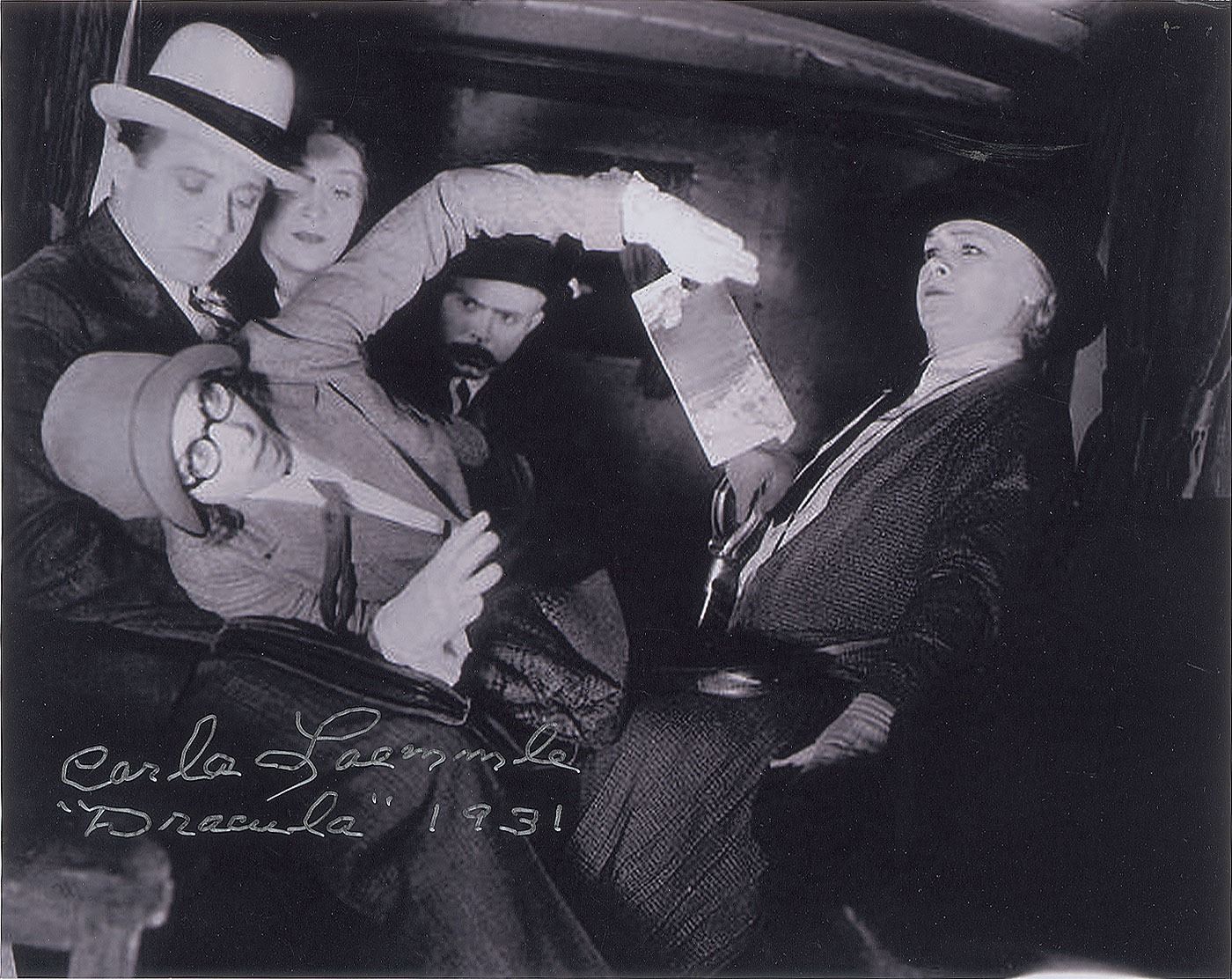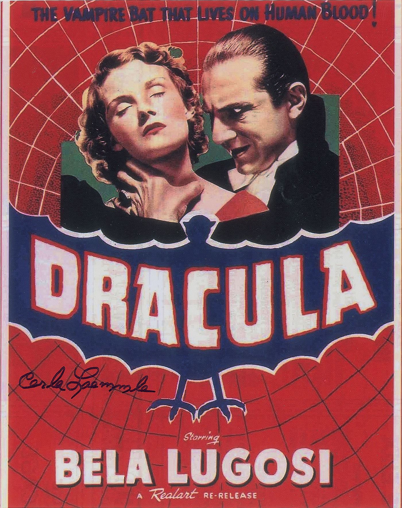 Two photos: a color satin-finish 8 x 10 photo of the poster for the 1931 horror classic Dracula, signed in black felt tip by Laemmle; and a satin-finish 10 x 8 photo of Laemmle as a startled coach passenger in a scene from Dracula, signed in silver ink, with Laemmle adding: "'Dracula' 1931." In overall fine condition, with grainy image quality to the scene. Originally obtained by in-person specialist Mike Wehrmann.