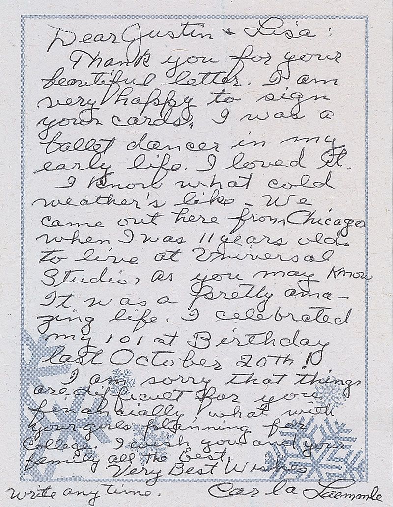 Actress (born 1909) and niece of Carl Laemmle, best remembered as the coach passenger who speaks the first lines of Dracula. ALS, one page, 4.25 x 5.5, no date (but 2011). Letter to “Justin and Lisa,” in part: “I was a ballet dancer in my early life. I loved it. I know what cold weather’s like. We came out here from Chicago when I was 11 years old to live at Universal Studio, as you may know. It was a pretty amazing life. I celebrated my 101st Birthday last October 20th!” In fine condition.