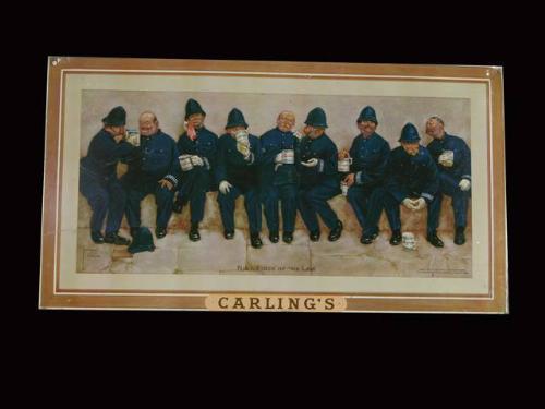 Carlings tin over cardboard advertising sign (Nine Pints of the Law) by Lamson Wood, good condition, 12 inches x 21 1/2 inches.