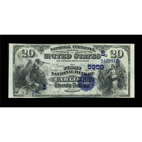 <B>Carlisle, KY</B></I> - $20 1882 Date Back Fr. 555 <B>The First NB</B></I> Ch. # (S)5959<BR> A beautiful example with great freshness and originality. It comes from the only bank in this small town to issue, and is one of a small run of 1882 Date Backs from here in pristine condition. Pen signed <B>Choice Crisp Uncirculated,</B></I> a real winner of a note.<BR><BR><b>Shipping:</b> Coins & Currency (<a target="_blank" href="http://www.heritageauctions.com/common/shipping.php">view shipping information</a>)