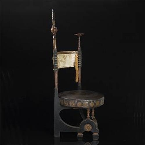 Carlo Bugatti<BR>chair<BR>Italy, c. 1900<BR>hand-decorated vellum, brass, leather, copper, wood<BR>18"w x 18"d x 49"h<BR><BR><BR><BR><BR><BR><BR>