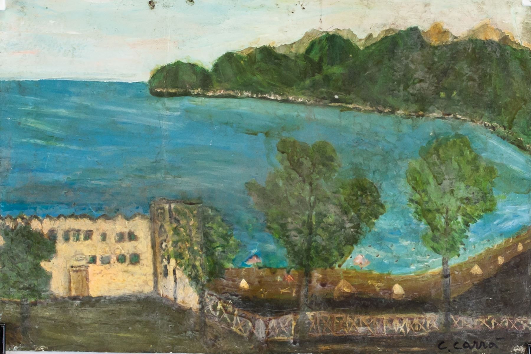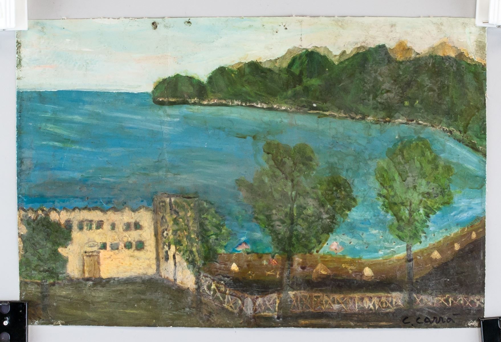 Oil on paper. Featuring a landscape scene of the coast. Signed c. carra on the lower right corner. Attributed to Carlo Carra (1881-1966, Italian). 26 x 40 cm (10.25 x 15.5 inches). PROVENANCE: Southern Ontario estate