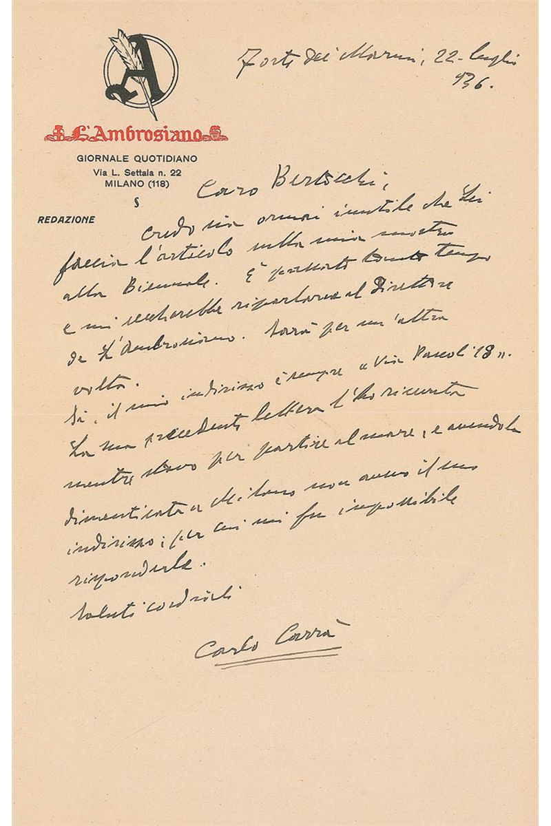 Italian painter (1881–1966) associated with Futurism. ALS in Italian, one page, 5.75 x 9, L’Ambrosiano letterhead, Forte dei Marmi, July 22, 1936. Letter to “Bertocchi,” translated in full: “I believe it is now useless that you write the article on my exhibition at the Biennalle. Too much time has passed, and I would now have to ask the newspaper director of the ‘Ambrosiano’ again. Let’s leave it for next time. Yes, my address stays the same, via Pascoli, 18. I have received your previous letters as I prepared to leave for the sea and because I left them in Milan I did not have your address and it was impossible to answer.” In fine condition, with mild central vertical and horizontal folds, a noticeable crease above the signature, and other light scattered creases.