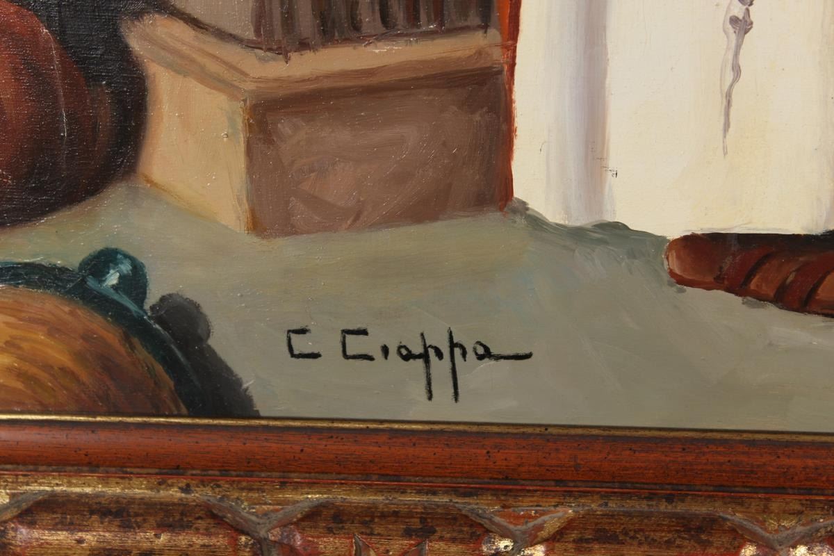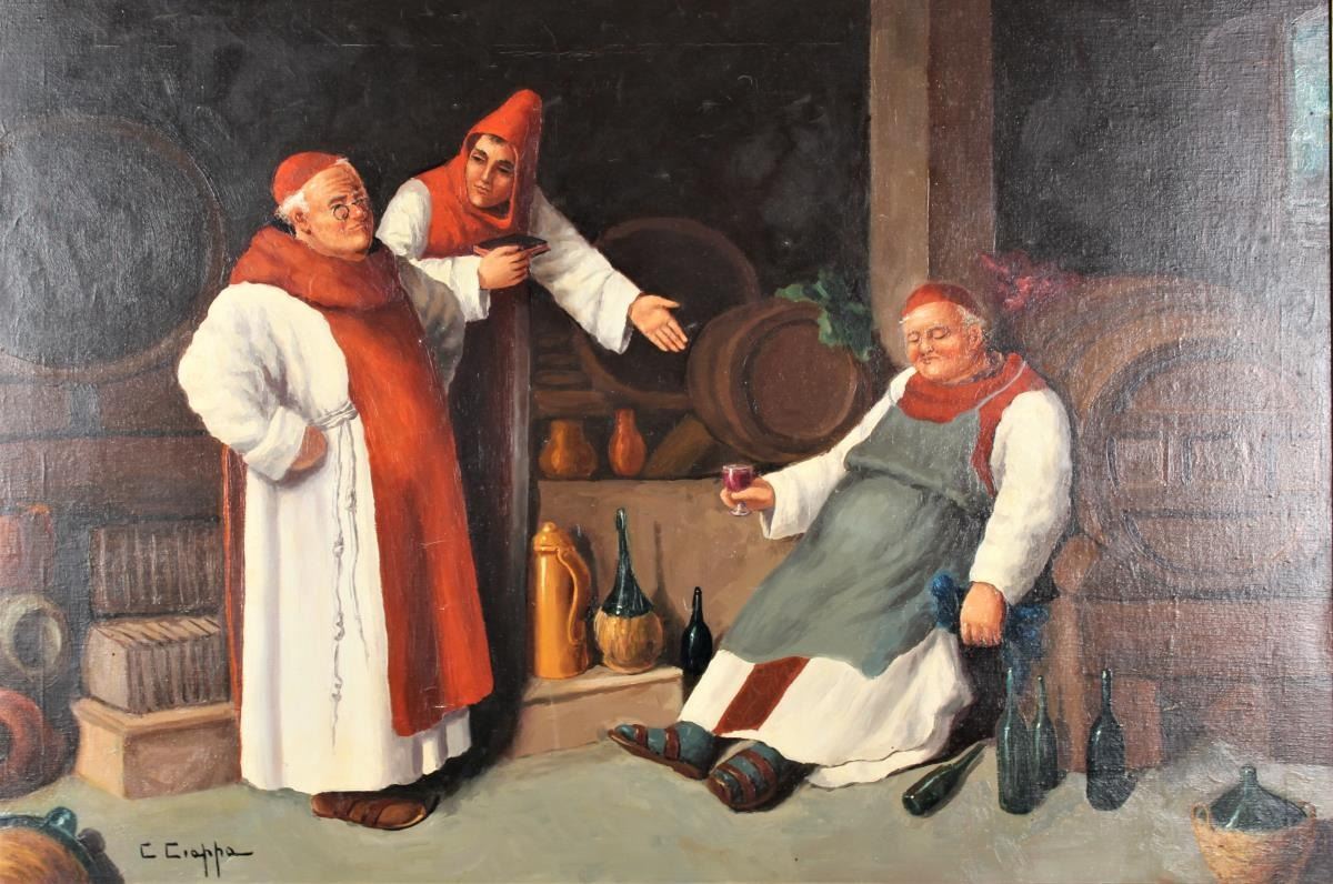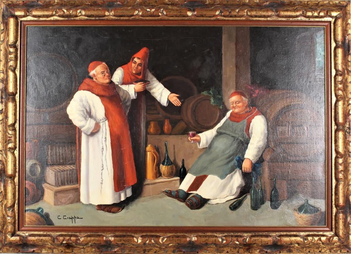 Friars in a wine cellar, oil on canvas, signed lower left. Carlo Ciappa was active/lived in Italy and is known for painting landscape, city scenes, genre.