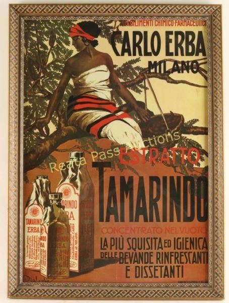 Vintage advertising poster reads "Carlo Erba Milano Estratto Tamarindo" South American lady advertising a liquor in gold lattice wood frame. Image size is 25"X16 1/2".