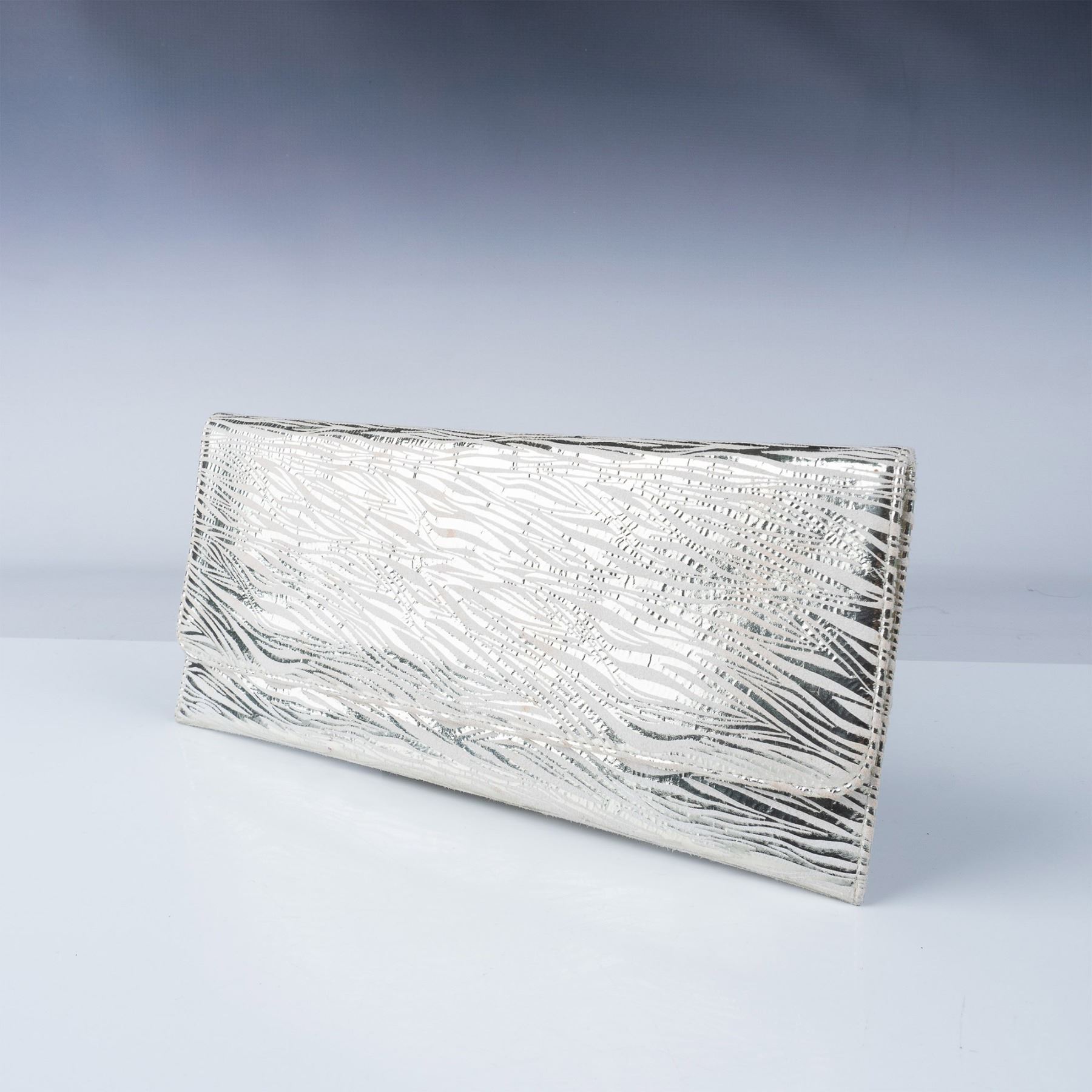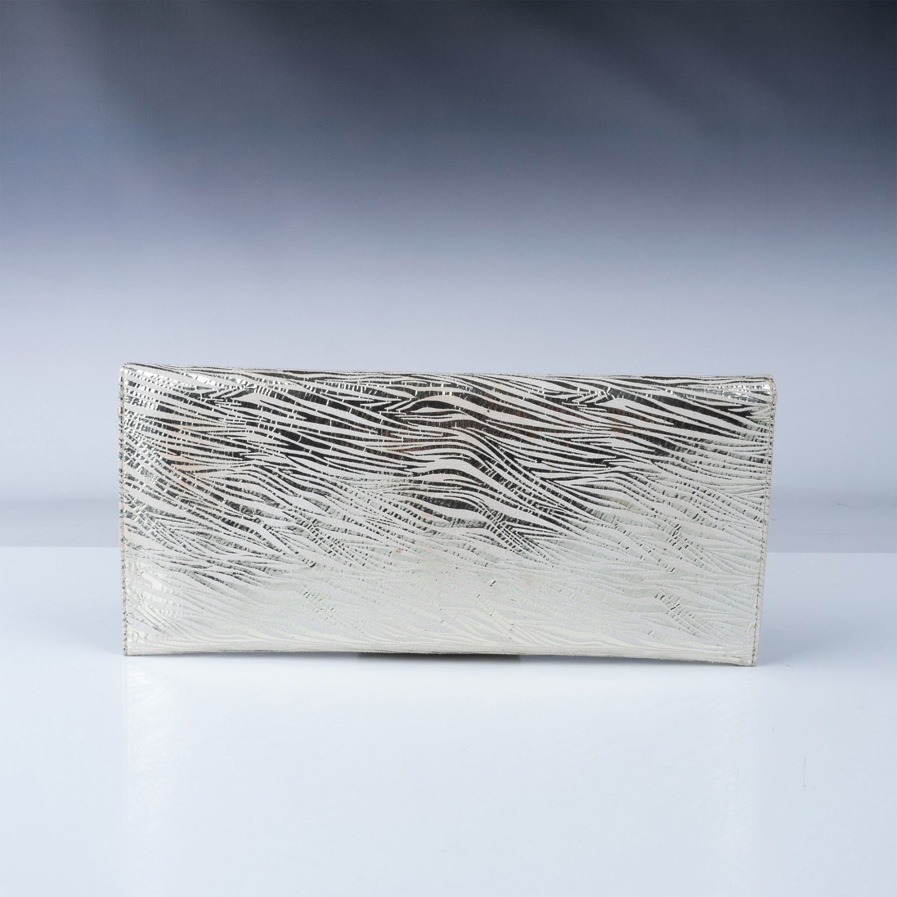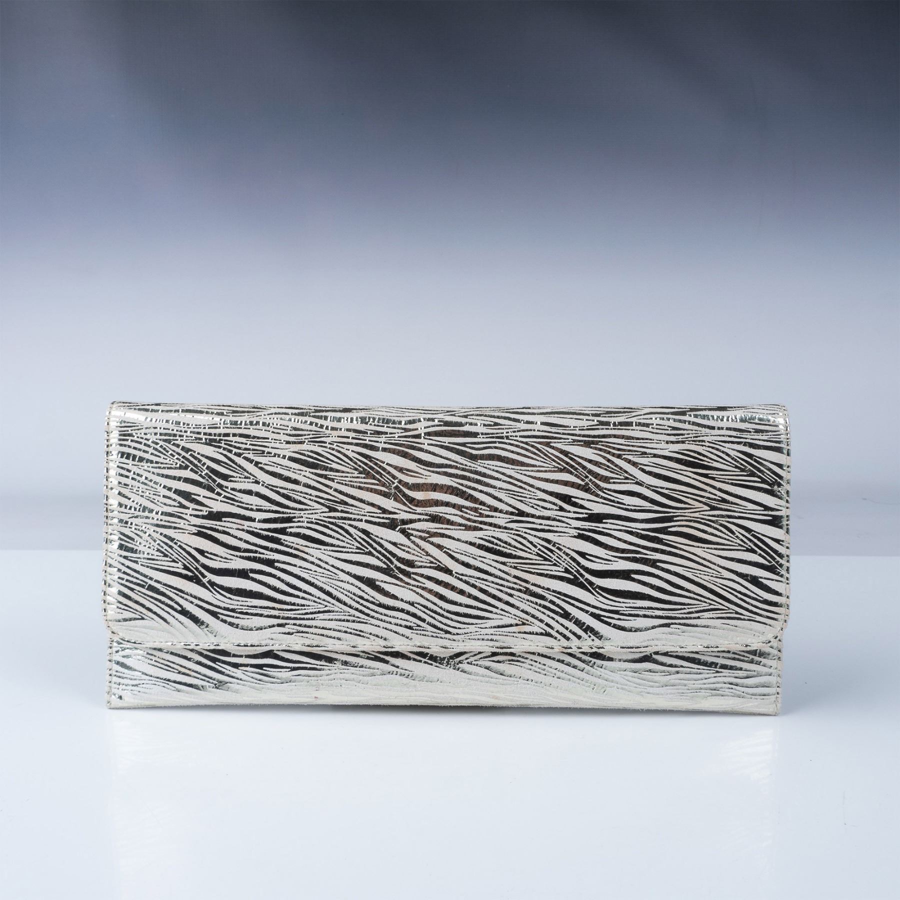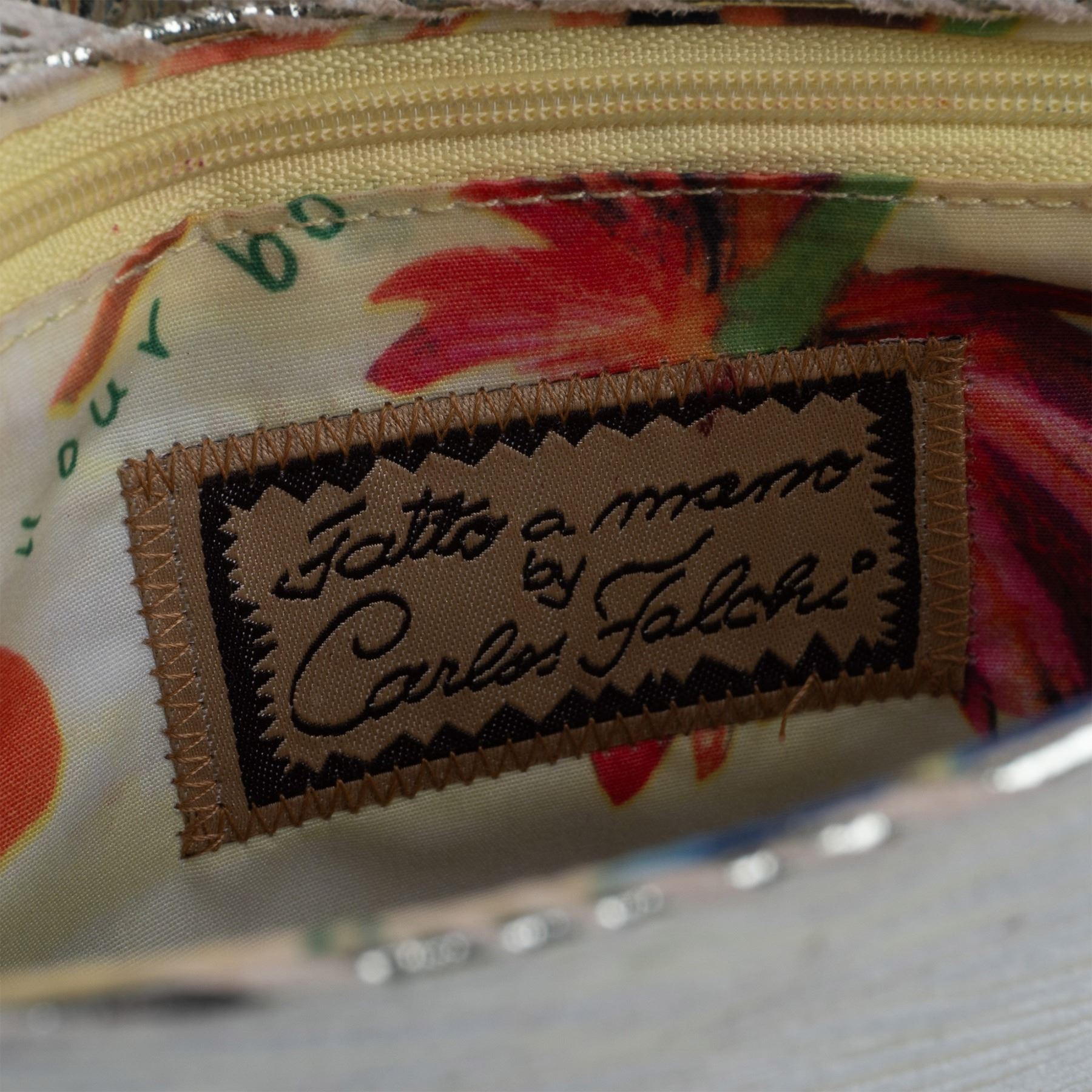 This is a stunning handmade Italian clutch designed by Carlo Falchi, renowned for his luxurious and artistic handbags. Known for impeccable craftsmanship and bold designs, Carlo Falchi has created a legacy in the fashion world, celebrated for unique combinations of texture and color. Clutch features a stylish metallic zebra pattern, a magnetic closure and a vibrant floral interior, offering a striking contrast and a touch of whimsy. Marked Fatto a Mano by Carlo Falchi.