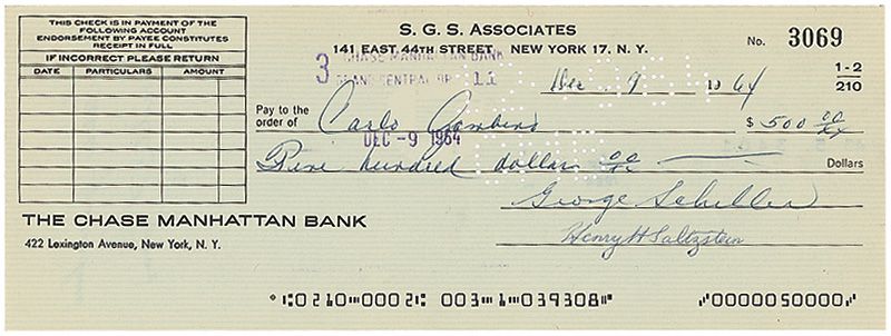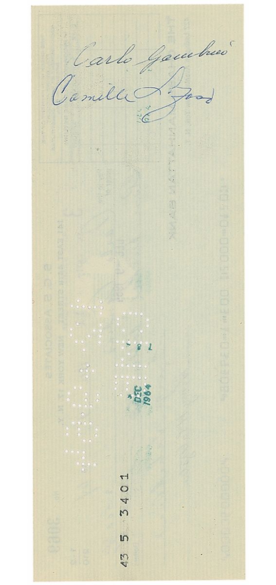 Endorsed S. G. S. Associates check, 8.25 x 3, filled out in another hand and signed by George Schiller and Henry Saltzstein, payable to Carlo Gambino for $500.00, December 4, 1964. Endorsed on the back in blue ink, "Carlo Gambino." In fine condition, with expected cancellation marks and holes.