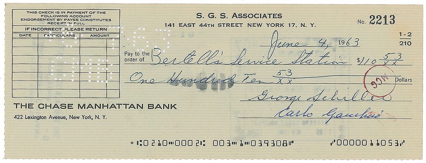 Boss of New York's most powerful crime family (1902–1976) and model for the title character in Mario Puzo's The Godfather. S. G. S. Associates business check, 8.25 x 3, filled out in another hand and signed by Gambino, "Carlo Gambino," payable to Bertelli's Service Station for $110.53, June 4, 1963. In fine condition.