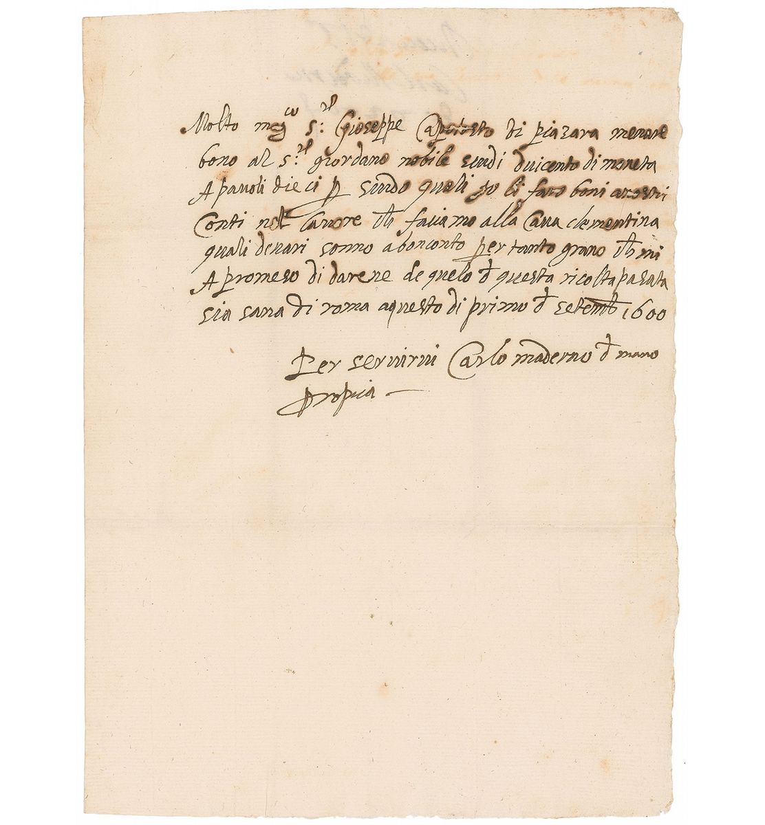 Swiss-Italian architect (1556–1629) considered one of the fathers of the Baroque style, best known for designing the facades of Santa Susanna, St. Peter's Basilica, and Sant'Andrea della Valle. Rare ADS in Italian, one page, 8 x 11, September 1, 1600. A credit note for 200 scudi for Giordano Nobile, who is instructed to take the money out of the deposit for the Cava Clementina project. Ink erosion to several letters throughout the main writing (not affecting the signature), otherwise fine condition. The ‘Cava Clementina’ was a project to canalize the river Velino near Reate, carried out by Carlo Maderno and Giovanni Fontana between 1596 and 1602 at the command of Pope Clement VIII. Maderno was the Pope's long-time architect, in charge of the work at St. Peter's and other churches in Rome. He also built several Roman palaces (including Palazzo Barberini), wells, fountains, and aqueducts. An exceedingly rare piece from this important architect.