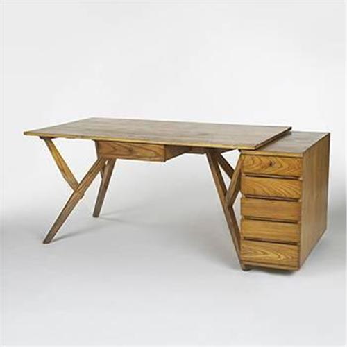 Carlo Mollino desk from Reale Mutua Assicurazioni Apelli & Varesio Italy, 1946 oak, brass 61 w x 35 d x 30 h inches Mollino designed several tables, desks and chairs for the Offices of the Societa Reale Mutua di Assicurazioni in Turin. The designs were drawn from a range of forms and styles he had utilized in his career up to 1945. This desk is constructed of four angular legs, each with a through-tenon stretcher attached to the top displaying Mollino's faceted, expressionistic style. Literature: Carlo Mollino: Architecture as Autobiography, Brino, ppg. 110-112 Carlo Mollino: Catalogo dei Mobili, Colombari, pg. 81 Il Mobili Italiano degli Anni '40 e '50, Guttry and Maino, pg. 213