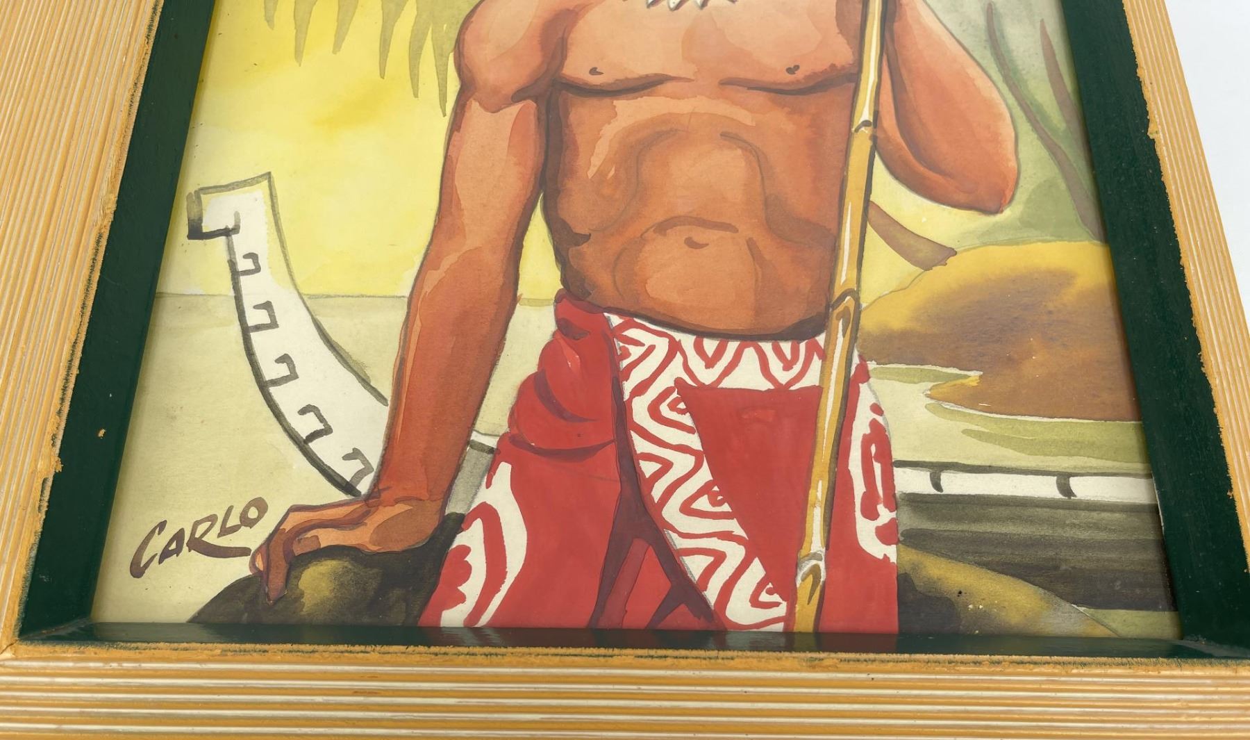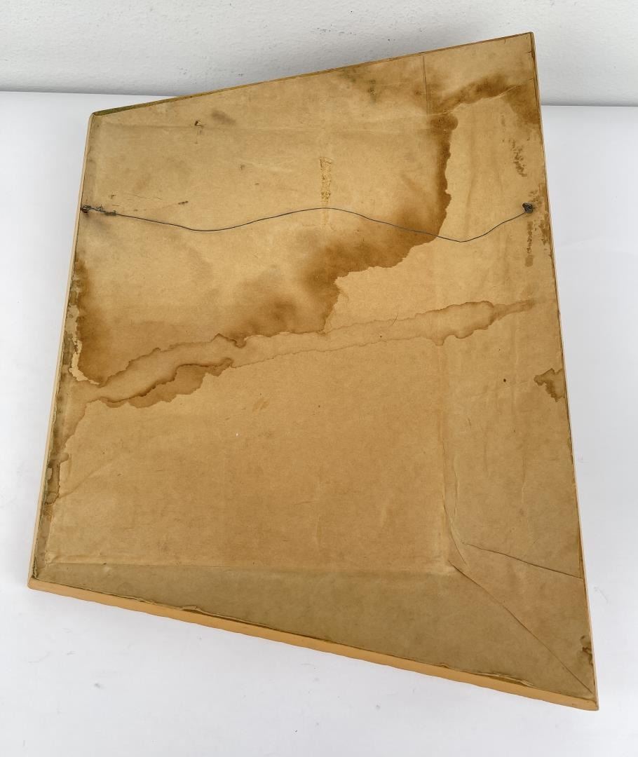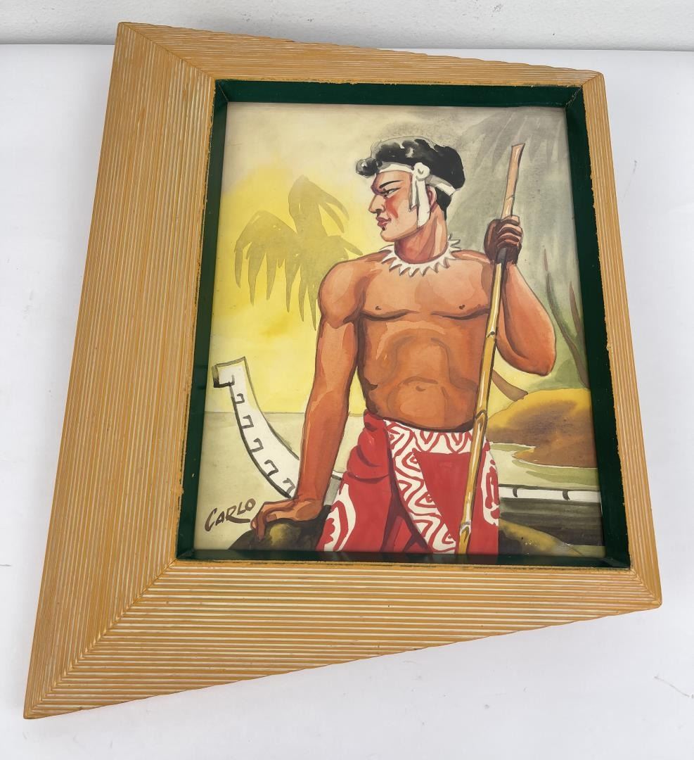 Wonderful Mid Century work of Art. By Renowned artist Carlo of Hollywood. Complete with correct abstract frame. 15" by 21" framed. Little is known about Carlo, other than his ubiquitous signature on many 1950s decorative art. He landed some major gigs, including art already in tract houses like those in the original Levitown , NY . The studio, known as ARTCRAFT was located in the Lincoln Heights Station area of Los Angeles . Considered one of the oldest neighborhoods in LA, the region once was graced by large Victorian mansions on the bluffs above the Los Angeles River . By the end of the 1940s, however, many of the neighborhood’s middle class residents began the exodus out of the city, leaving MANY storefronts and warehouses/lofts available for fledgling artists and their companies. ARTCRAFT was such a company when they set up shop in what’s known affectionately as "the hills." Carlo was a real artist who hired out equally talented artists while he collected incredibly lucrative gigs for his hand-painted, ORIGINAL art. ARTCRAFT did not have the money or techniques to make machine-prints. Instead, each image put out by the company is unique and has the essence of the founder: CARLO OF HOLLYWOOD . My own research on Carlo uncovered the following interesting bit of information for all your retro-mid-1950s art sleuths. He painted as early as the 1950s. Carlo uses many mediums, typically focusing on oils and watercolors. The style and subjects of each medium are usually unique to that medium and differ from the others. His oils are often grand landscapes while his watercolors are typically portraits and action scenes. His art was carried in department stores and included with tract housing. "About Our Paintings – Artcraft of Hollywood is fortunate to have under exclusive contract 43 talented young artists who paint by special order only the beautiful originals our art directors create. Each and every artist has his own technique and style which therefore prohibits the finding of another painting exactly such as this. It is our aim to turn art "yearners into art owners by offering sensibly priced Originals by American Artists. We hope you feel the same emotion when looking at this beautiful painting as the artist felt when he was painting it. Judge its value by how much feeling you get out of it and how strong the feeling registers. –Artcraft of Hollywood