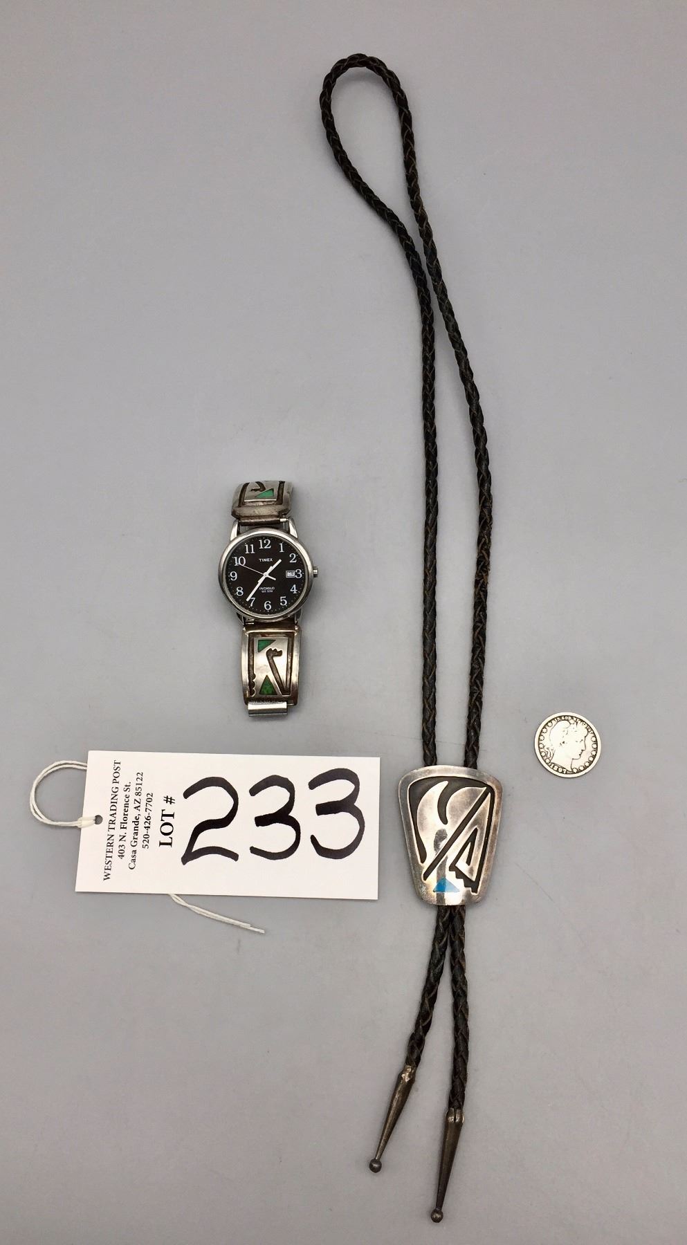 Description: Sterling silver watch and bolo by Carlos Dias of Tucson, AZ. Maker: Carlos Diaz. Approx. Age: Vintage. Size: Bolo measures 36” around the neck and the slide measures 1 7/8” l x 1 1/2” w. watch tips measure 1” l x 7/8” w, stretch band is 3 1/2” l. Total weight of 95.5 g. Condition: Good for their age, normal wear expected. Please look closely at the pictures - they are an important part of our description. Shipping: There will be a $5 handling / packaging fee for shipping this lot. The actual cost of postage will be added on top of that.
