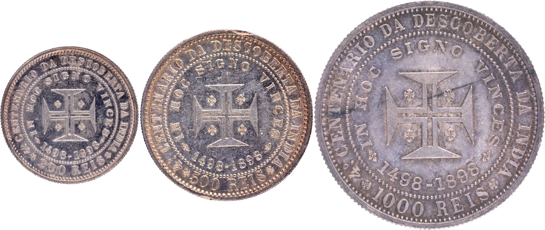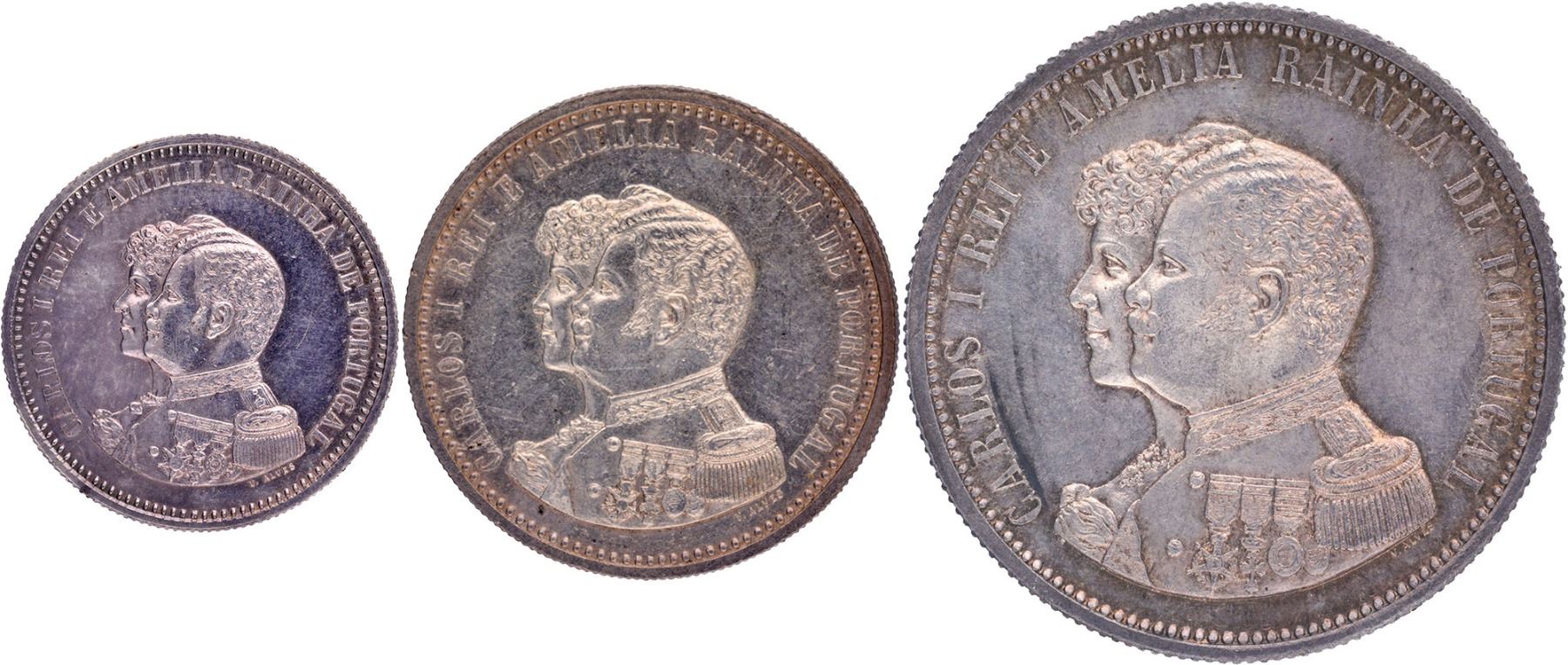 Portugal, Carlos I (1889-1908),Silver, 200, 500 1000 Reis,Set of 3 Coins, 1898,Obv:conjoined busts of King Charles I of Portugal and Queen Amelie facing left, lettering around the field,Rev:Maltese cross with four rosettes in the fields, motto around with dates, denomination and issue details on the outer field,4.9g, 12.3g, 25g, 23.97mm, 30.58mm, 37.38mm,(KM # 537, 538 539),about extremely fine, Rare as a set.