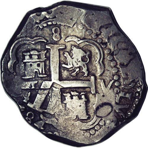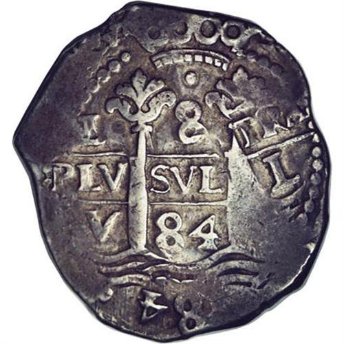 <B>Carlos II cob 8 Reales 1684-V, </B></I>KM24, choice toned VF-XF, three clear dates, small ink number on the reverse, ex-Von Schuckmann Collection.<BR><BR><b>Shipping:</b> Coin/Currency (<a target="_blank" href="http://www.heritageauctions.com/common/shipping.php">view shipping information</a>)